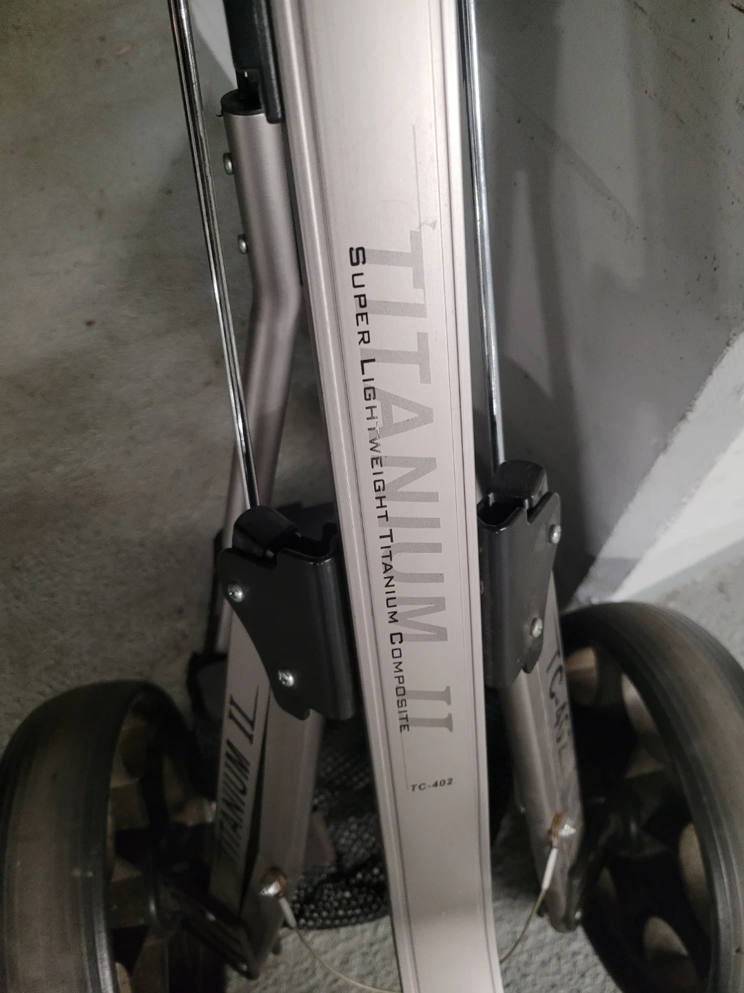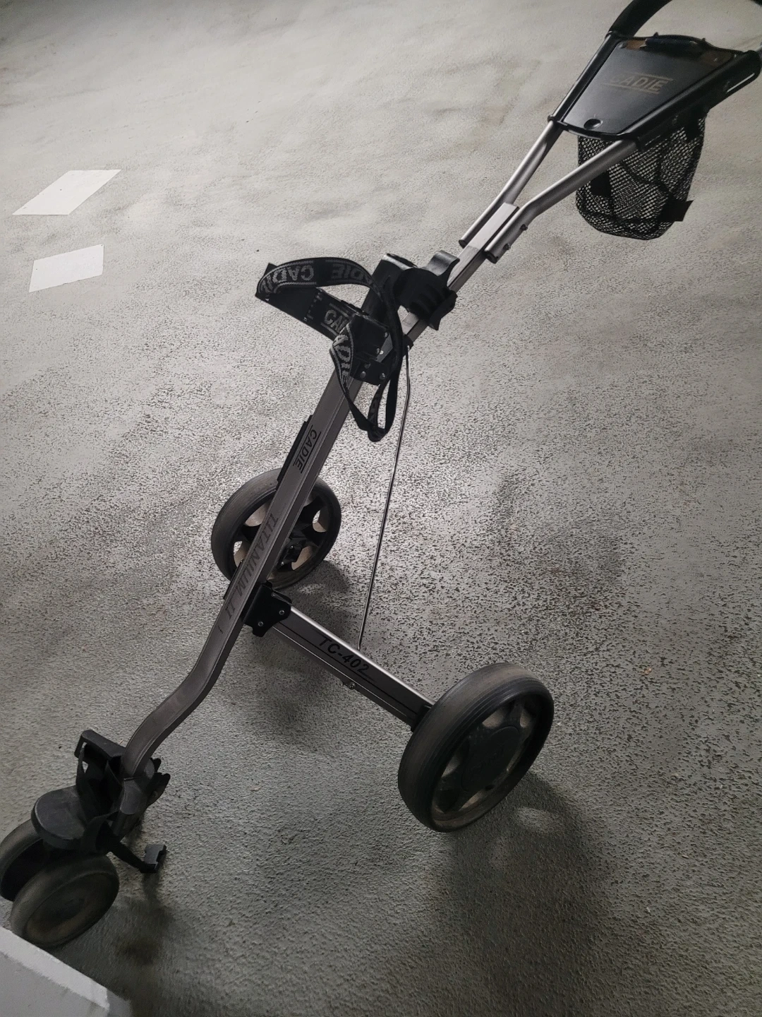 This CADIE Titanium II golf push cart is super lightweight and made from titanium composite. It features a mesh storage basket and a comfortable handle. Great for carrying your golf bag around the course!Has four wheels