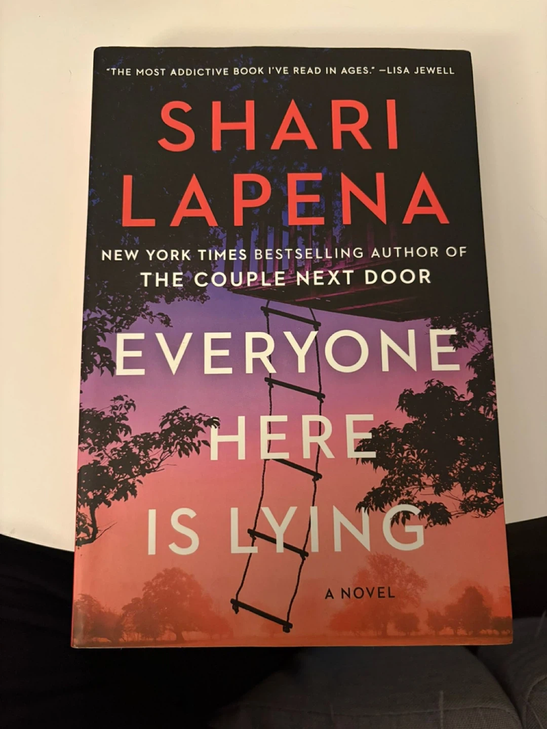 This is a copy of the novel 'Everyone Here Is Lying' by Shari Lapena. It's a New York Times bestselling thriller. Fans of 'The Couple Next Door' will enjoy this too!