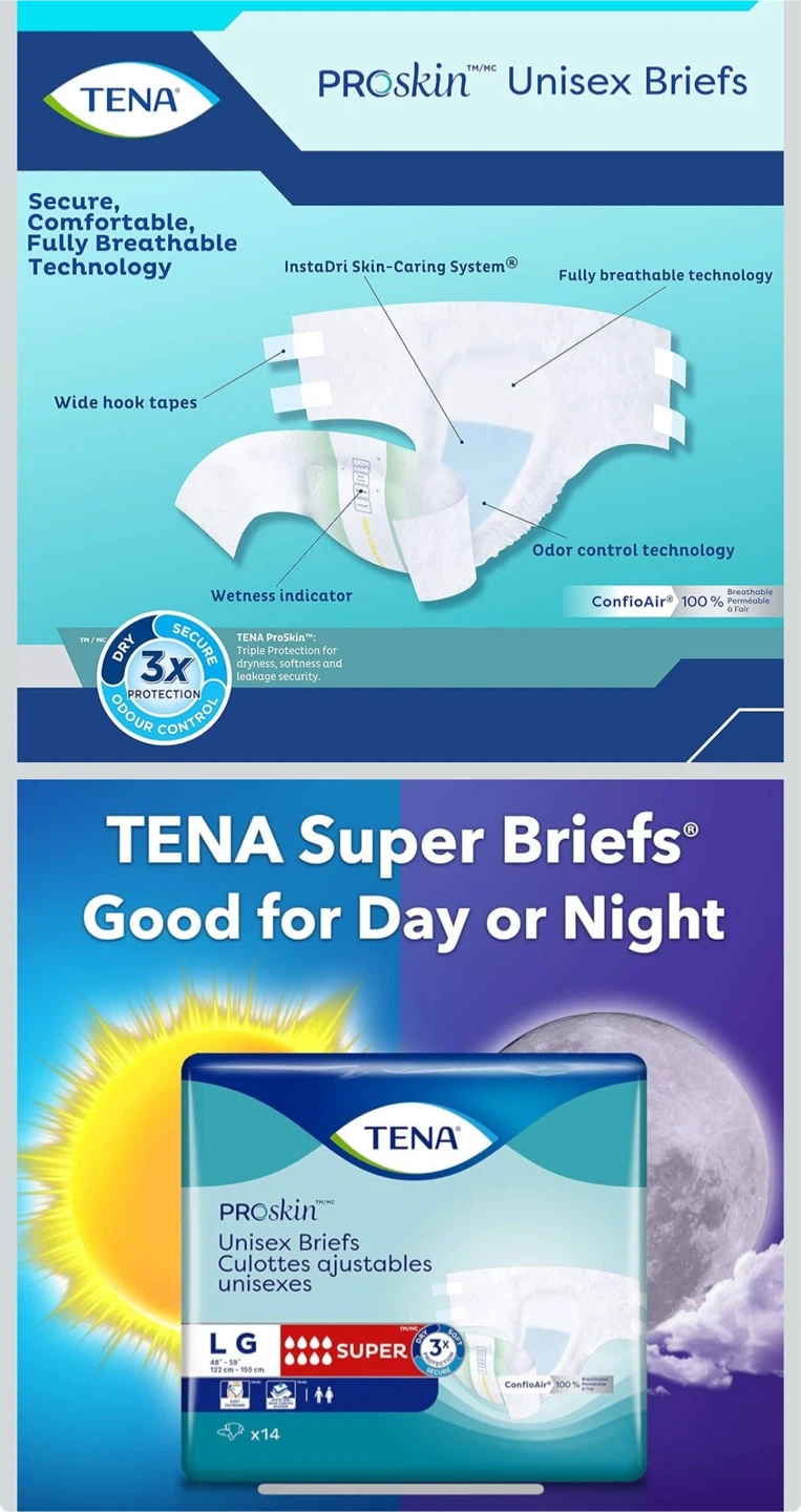 Selling a pack of TENA ProSkin unisex briefs in size X-Large. These are super absorbent and breathable, perfect for day or night use. They feature InstaDri Skin-Caring System and odor control technology to keep you feeling secure and comfortable. Wide hook tapes ensure a secure fit, and the wetness indicator lets you know when it's time for a change