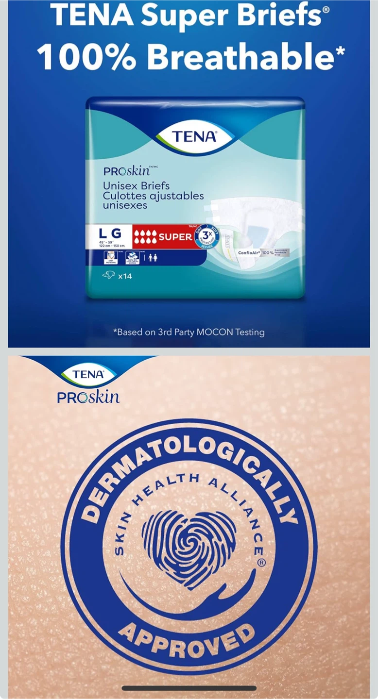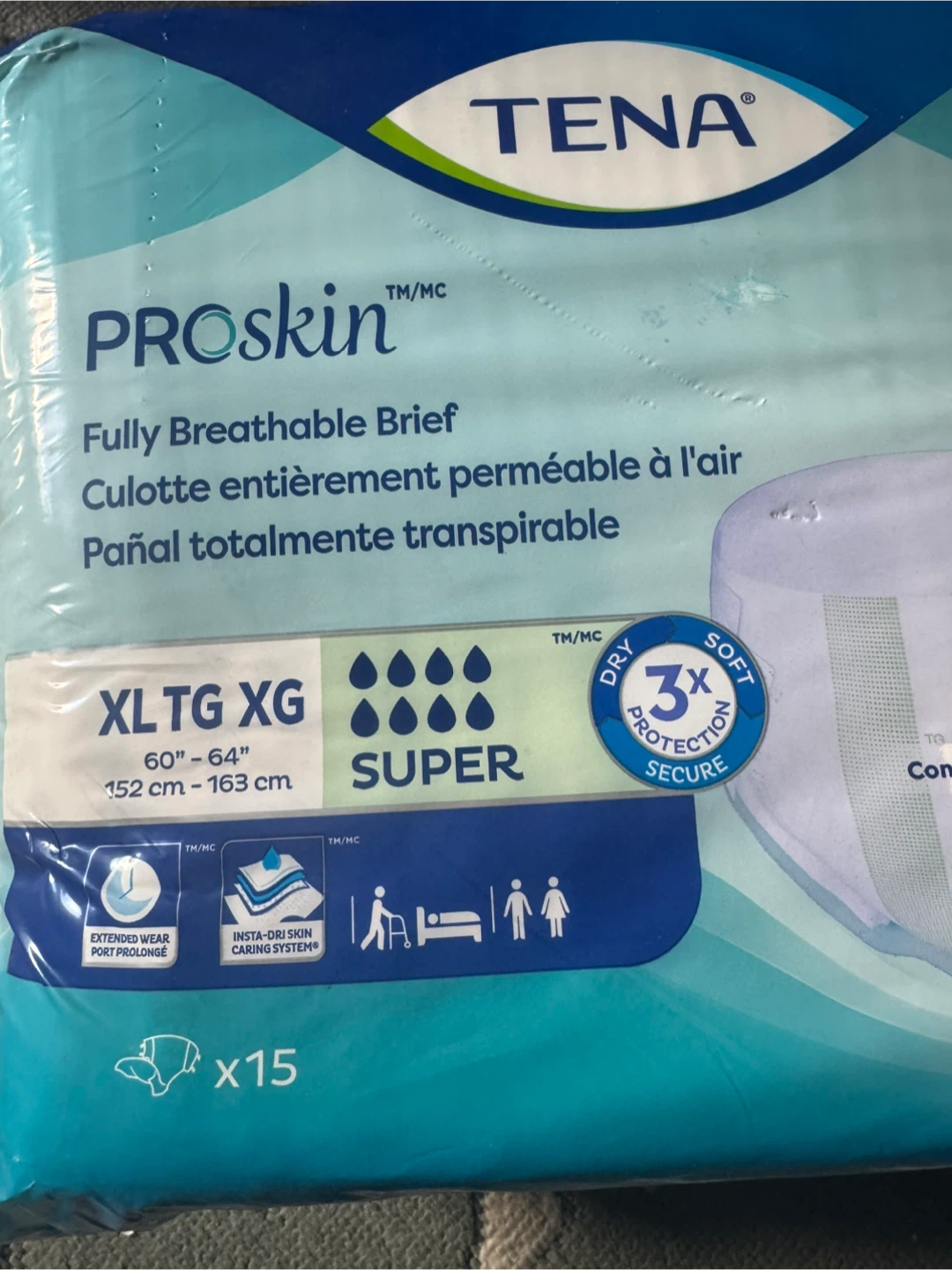 Selling a pack of TENA ProSkin unisex briefs in size X-Large. These are super absorbent and breathable, perfect for day or night use. They feature InstaDri Skin-Caring System and odor control technology to keep you feeling secure and comfortable. Wide hook tapes ensure a secure fit, and the wetness indicator lets you know when it's time for a change
