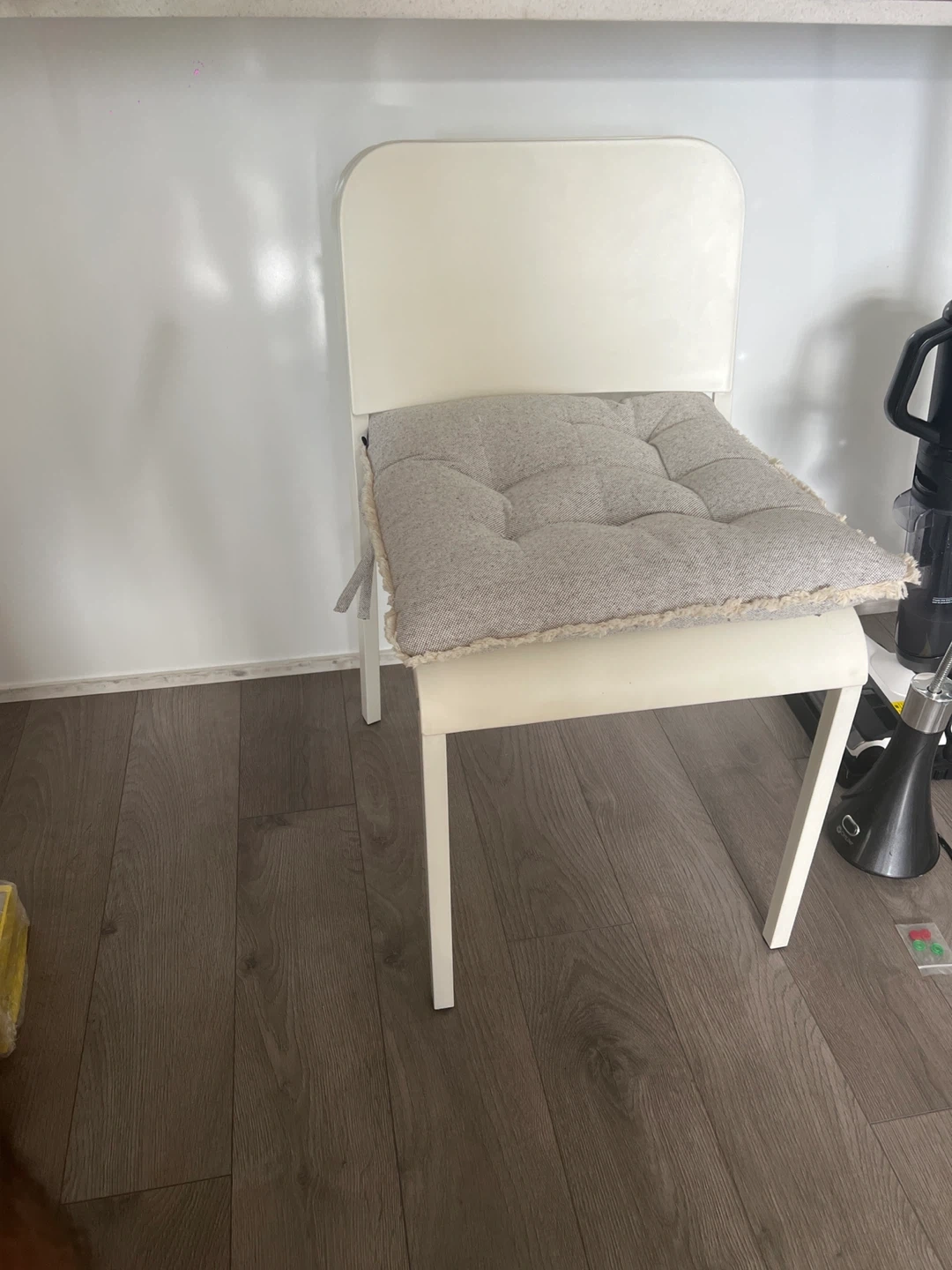 Selling a simple white chair that comes with a comfy grey cushion! It's in great shape and would be perfect for a desk or dining area. The cushion adds a nice touch of comfort and style. Let me know if you're interested!