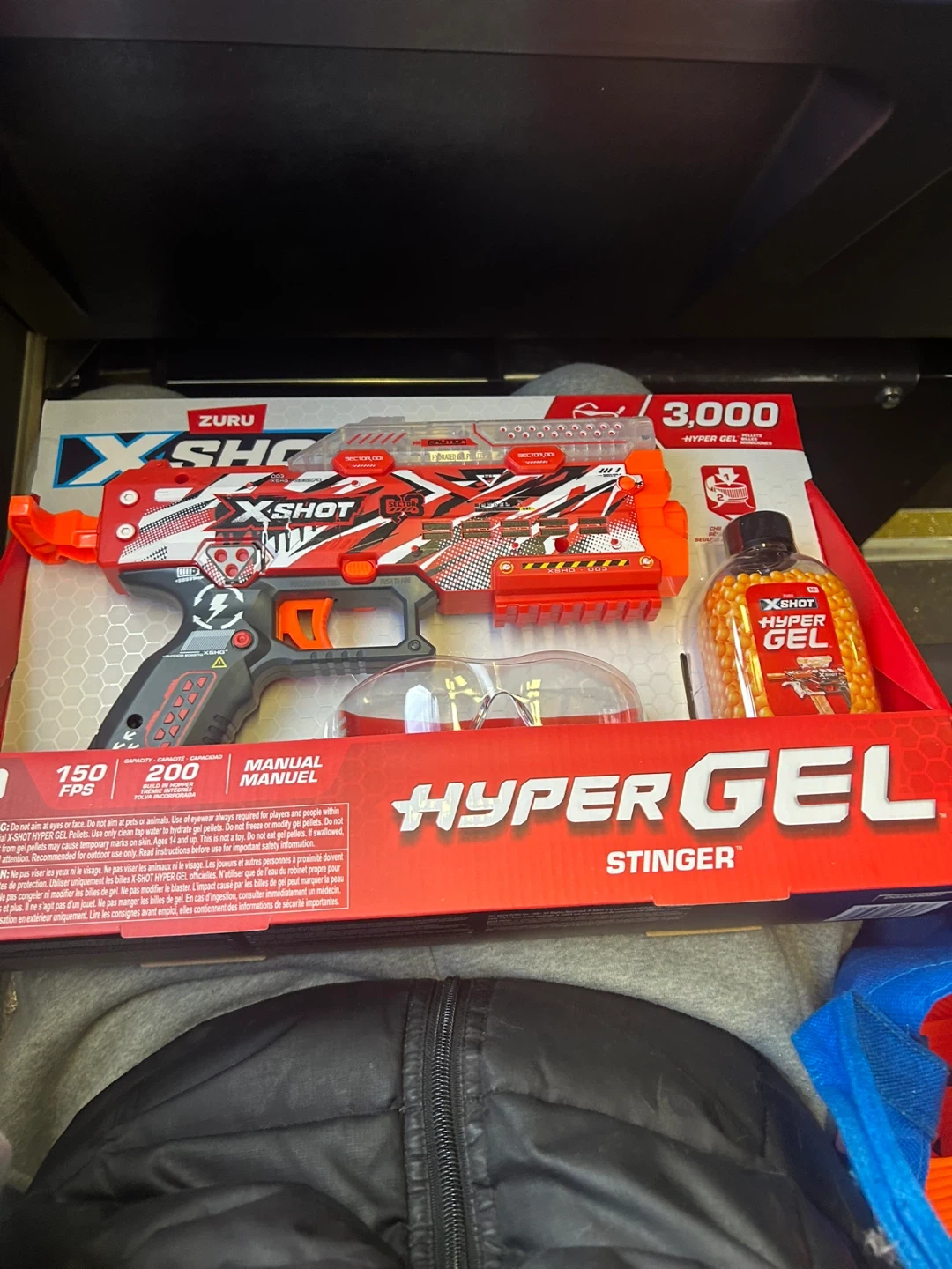 Selling a brand new X-Shot Hyper Gel Stinger Blaster, still in its original packaging! This manual blaster shoots up to 150 FPS and comes with 3,000 Hyper Gel pellets. It also includes safety glasses. Great for some outdoor fun!