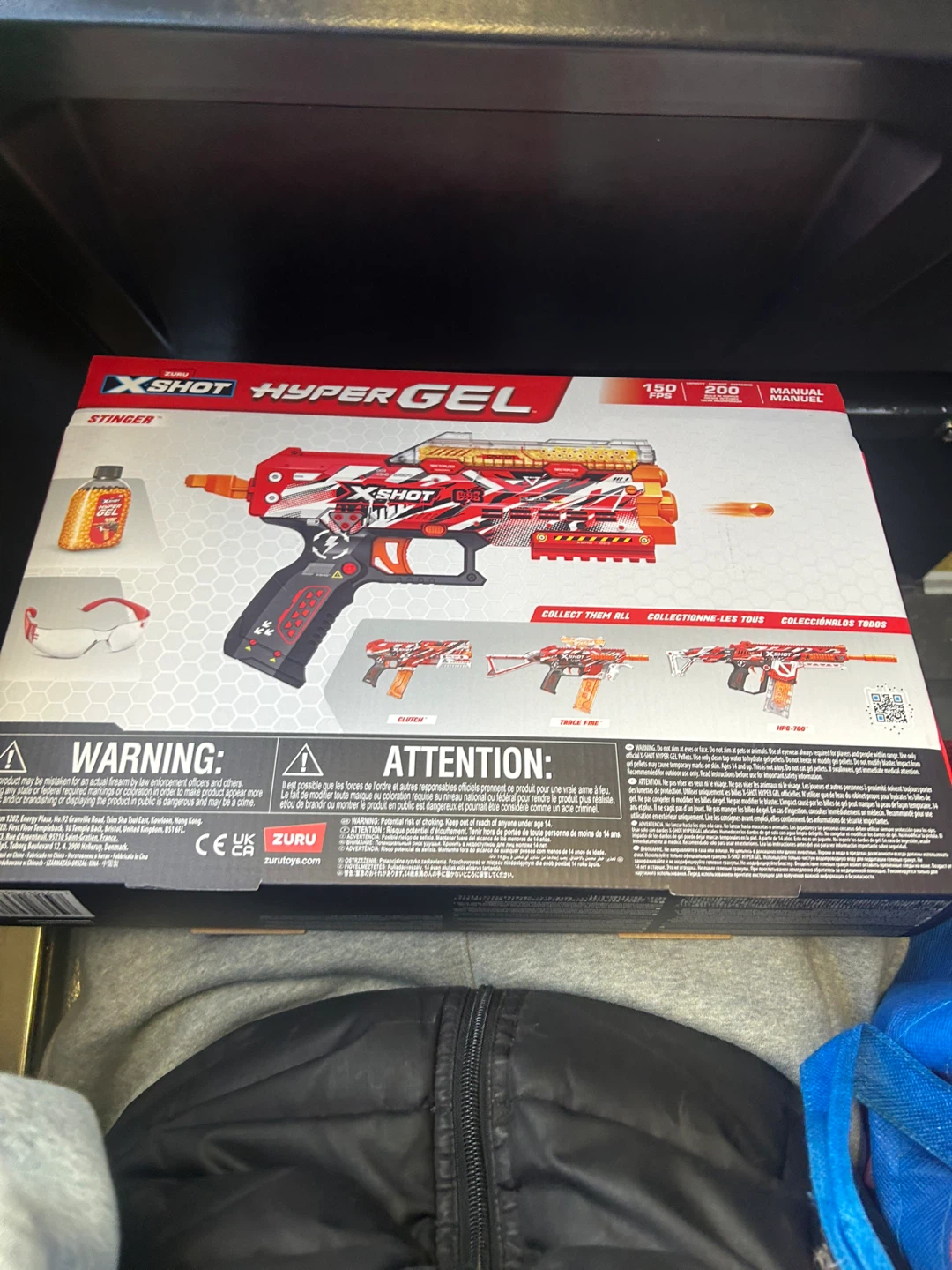 Selling a brand new X-Shot Hyper Gel Stinger Blaster, still in its original packaging! This manual blaster shoots up to 150 FPS and comes with 3,000 Hyper Gel pellets. It also includes safety glasses. Great for some outdoor fun!