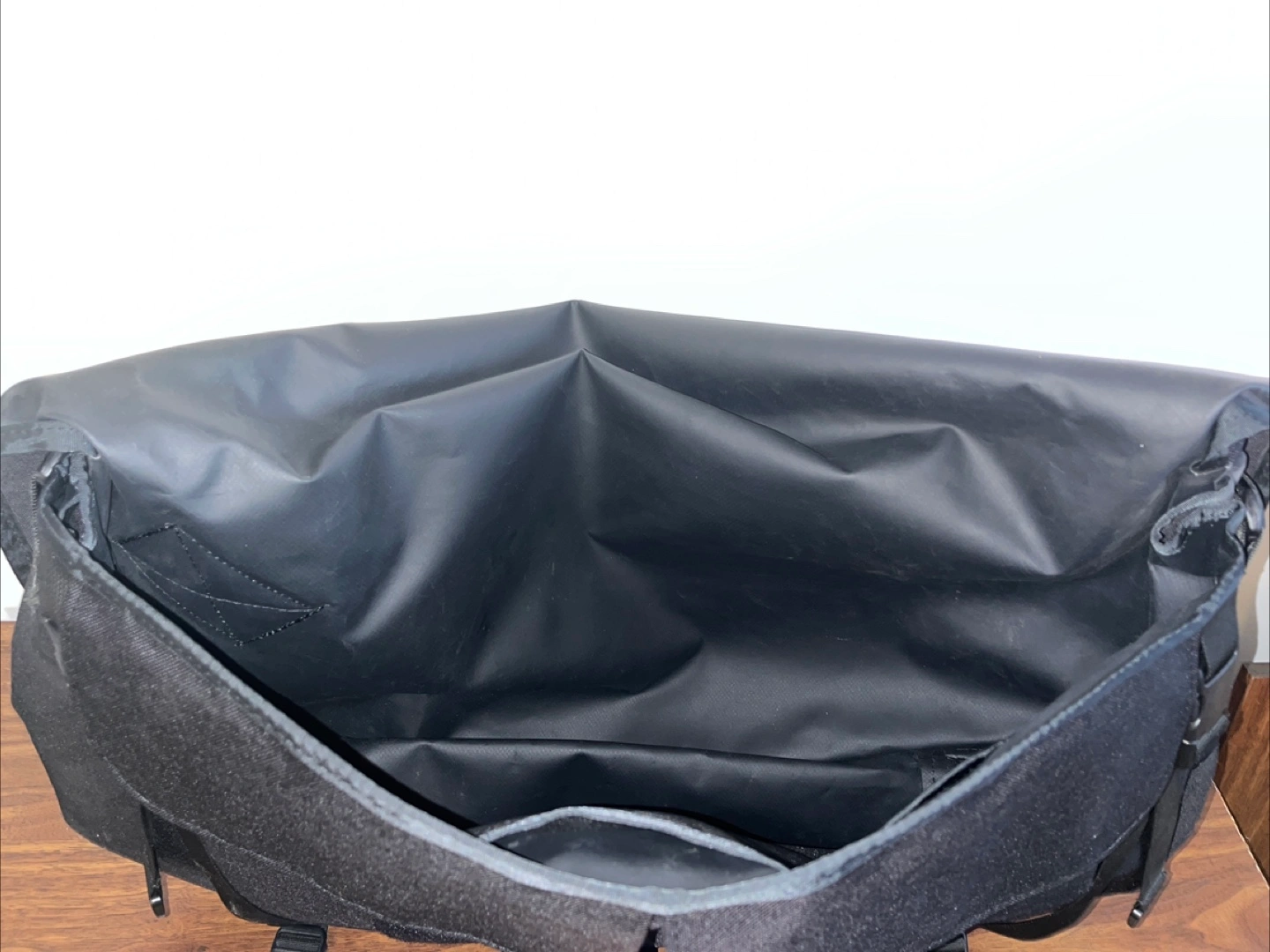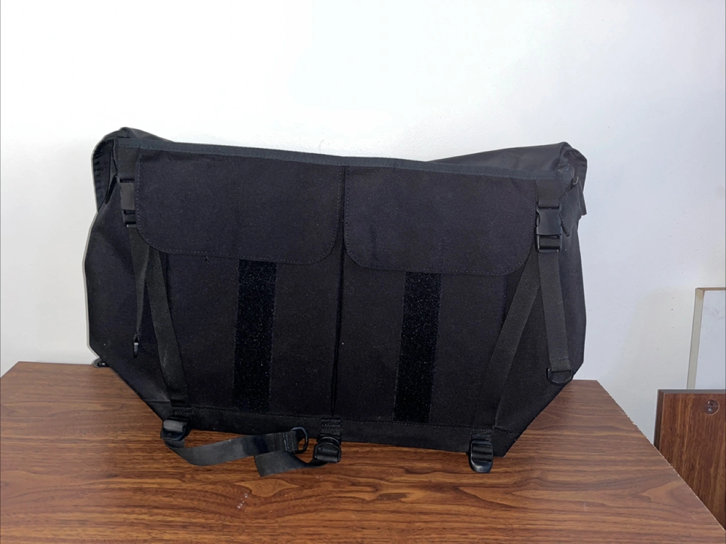 This black messenger bag features a waterproof interior lining. It has multiple buckles for closure and adjustable straps. Rarely used.