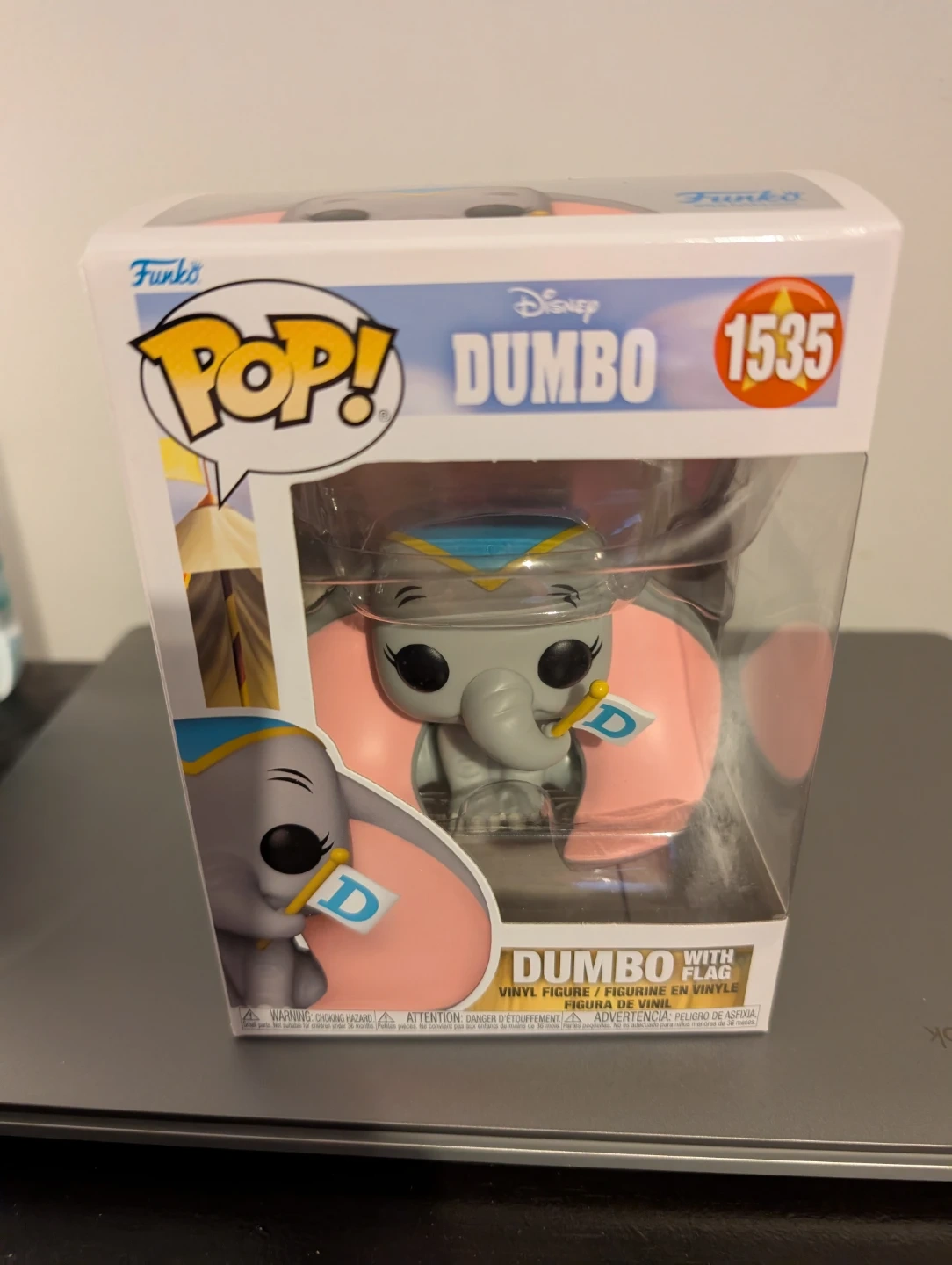 This is a Funko Pop! vinyl figure of Dumbo the elephant holding a flag. It's part of the Disney collection and is item number 1535. The figure comes in its original box.