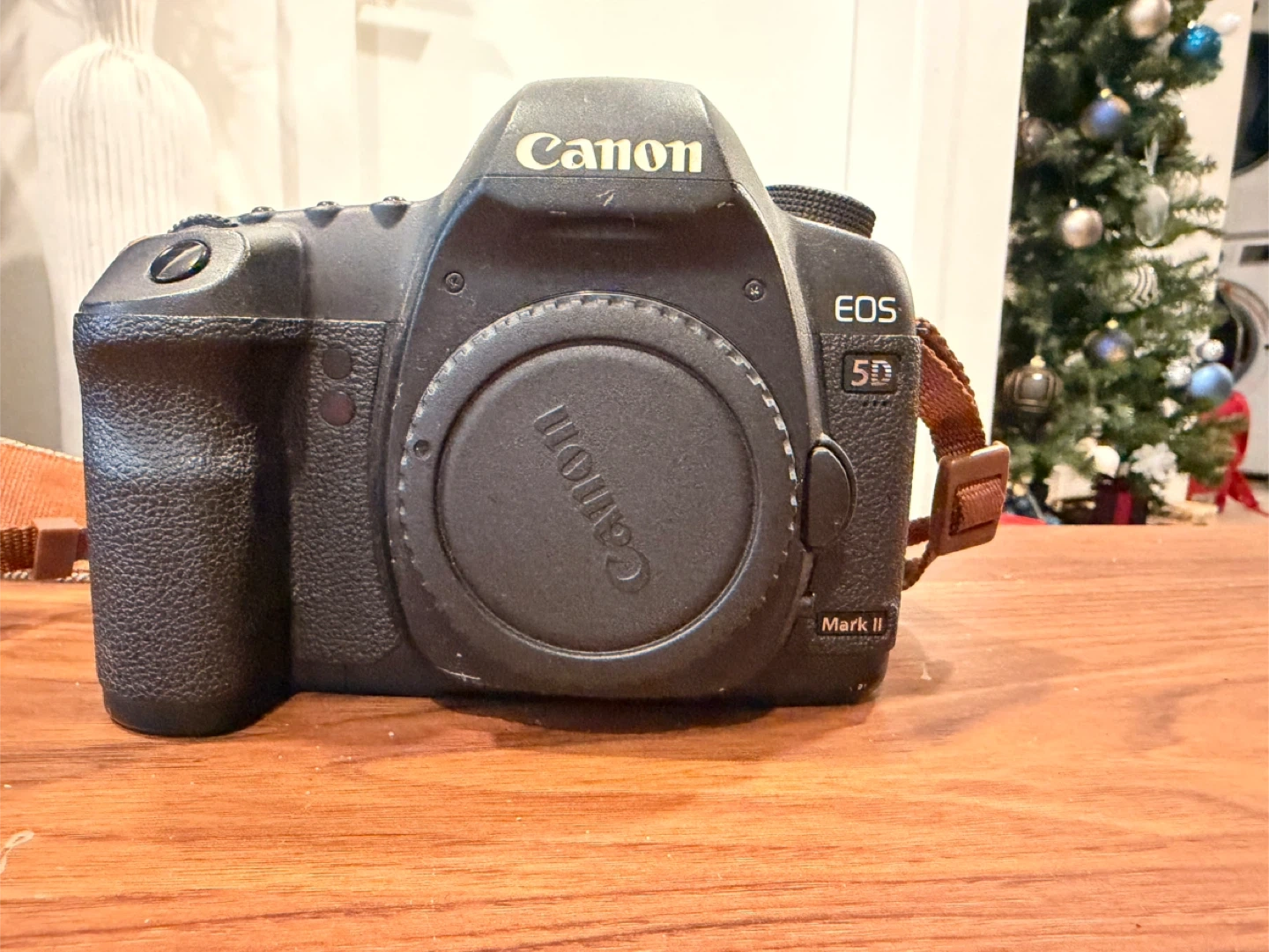 Selling a Canon EOS 5D Mark II DSLR camera. It's a great full-frame camera for photography enthusiasts. It shows some signs of use but is in good working condition.
