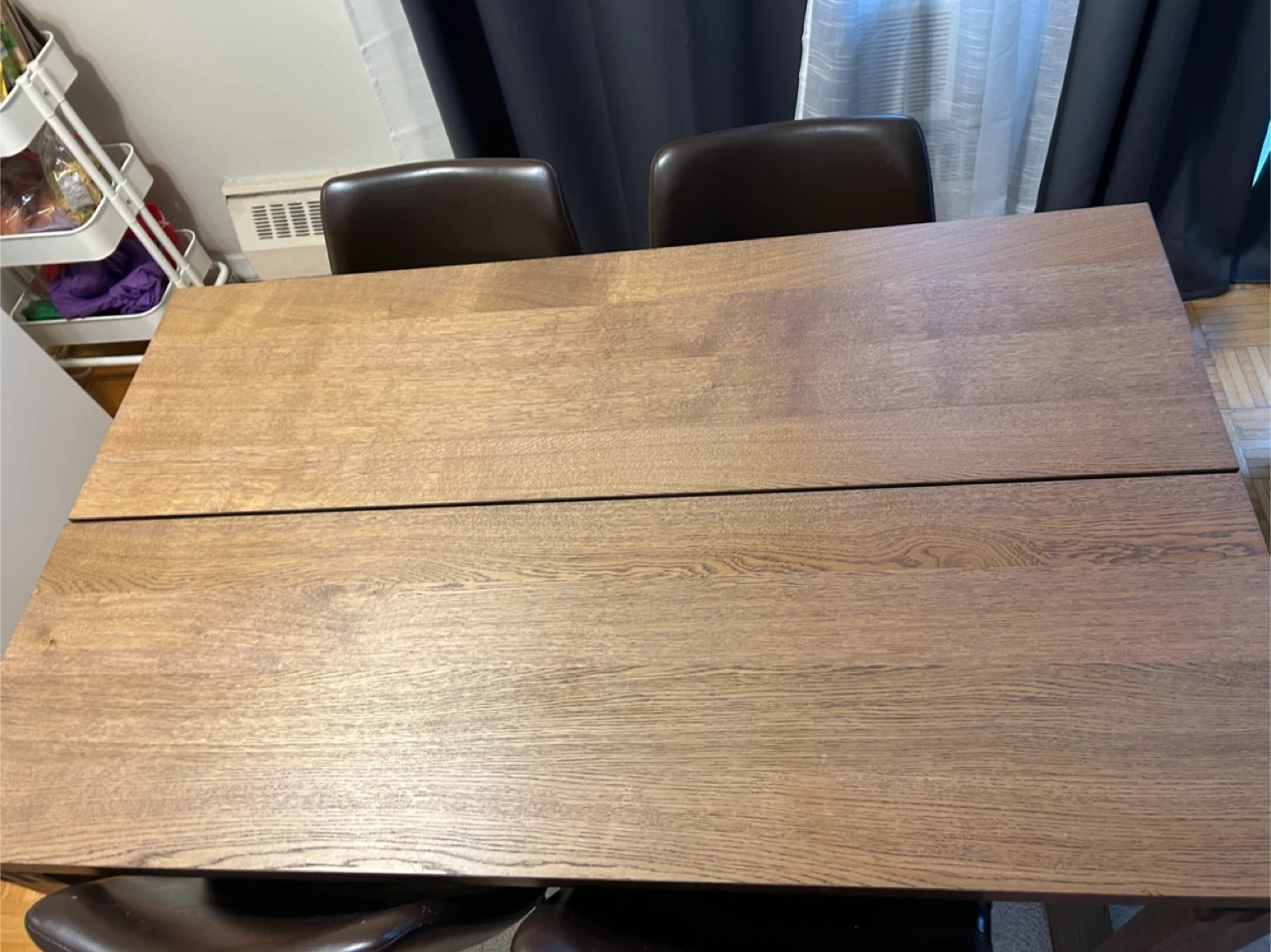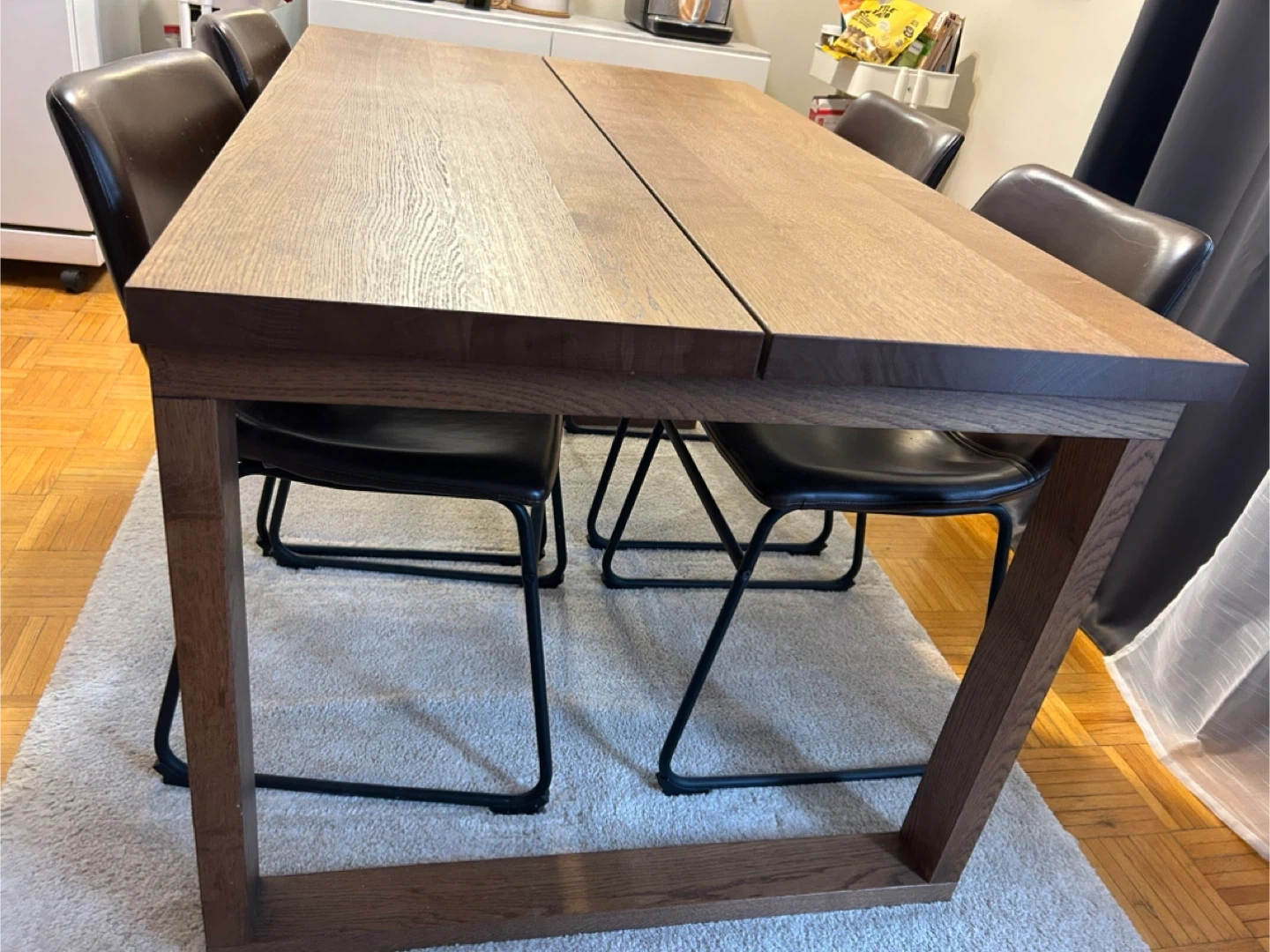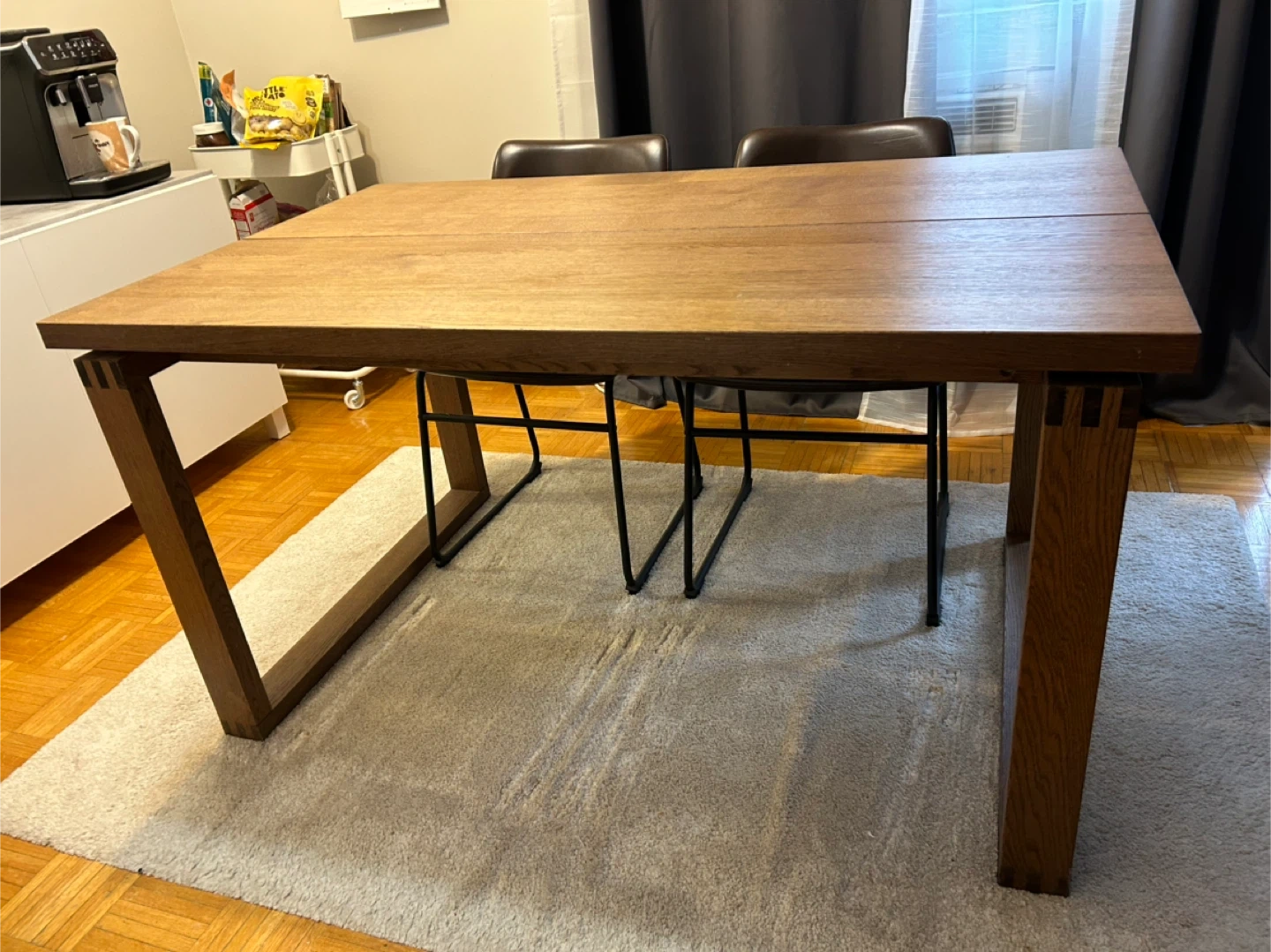 Selling our much-loved IKEA MÖRBYLÅNGA dining table, purchased in 2020. Unlike the newer models currently sold at IKEA, this version is made with real wood veneer, giving it a much warmer, more solid, and high-quality feel. In excellent condition - 2 minor chips on one side of the table.