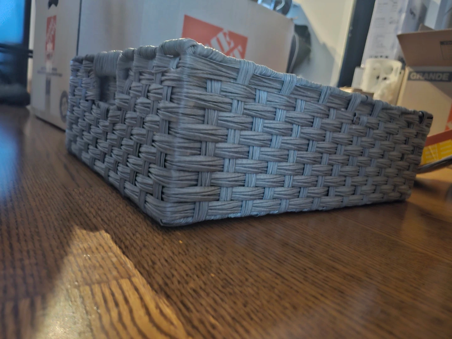 Two grey woven storage baskets with integrated handles. Perfect for organizing shelves or keeping items tidy. The material is a durable woven plastic. Pickup at 763 Bay St