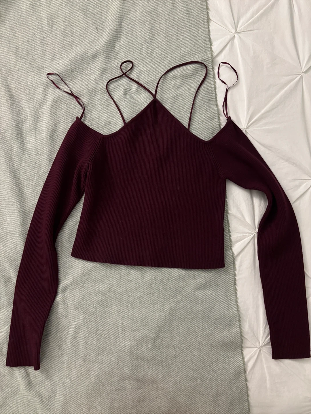 This maroon long-sleeve crop top features a trendy cold shoulder design with criss-cross straps. It's made from a comfortable ribbed knit material. Perfect for a night out!