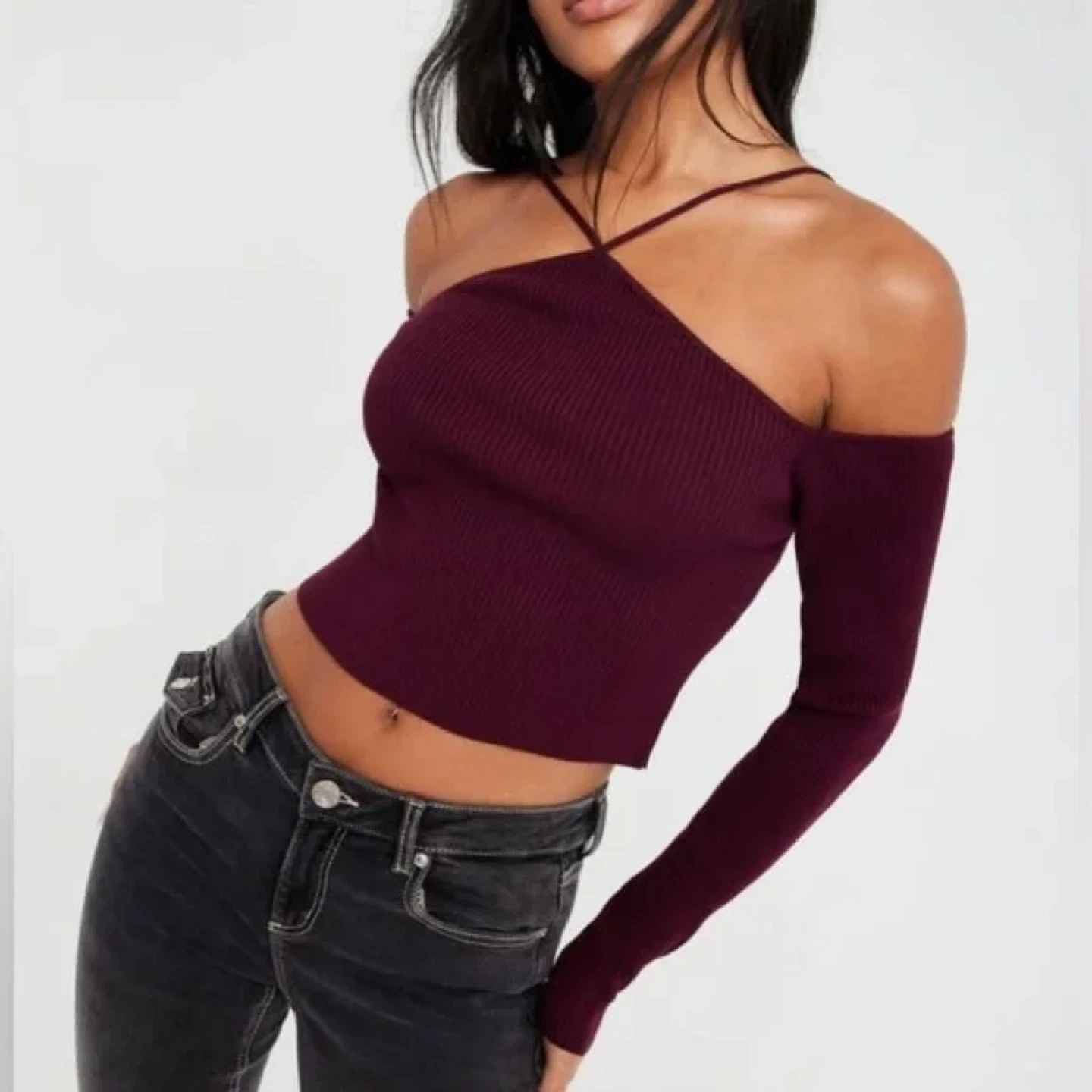 This maroon long-sleeve crop top features a trendy cold shoulder design with criss-cross straps. It's made from a comfortable ribbed knit material. Perfect for a night out!