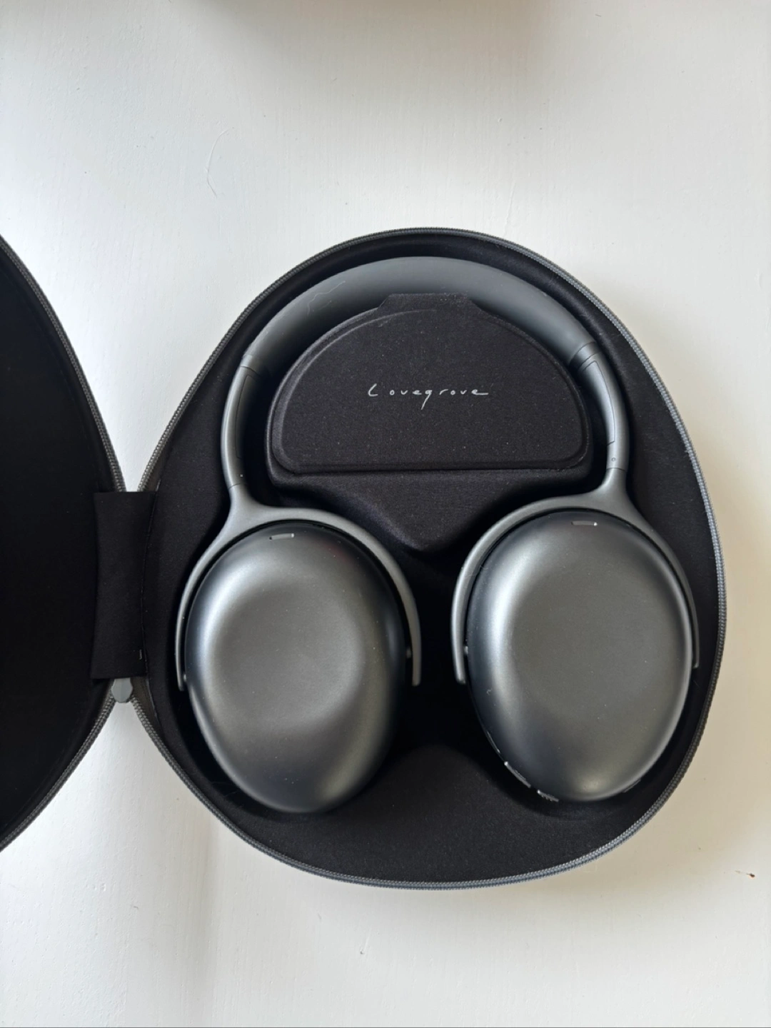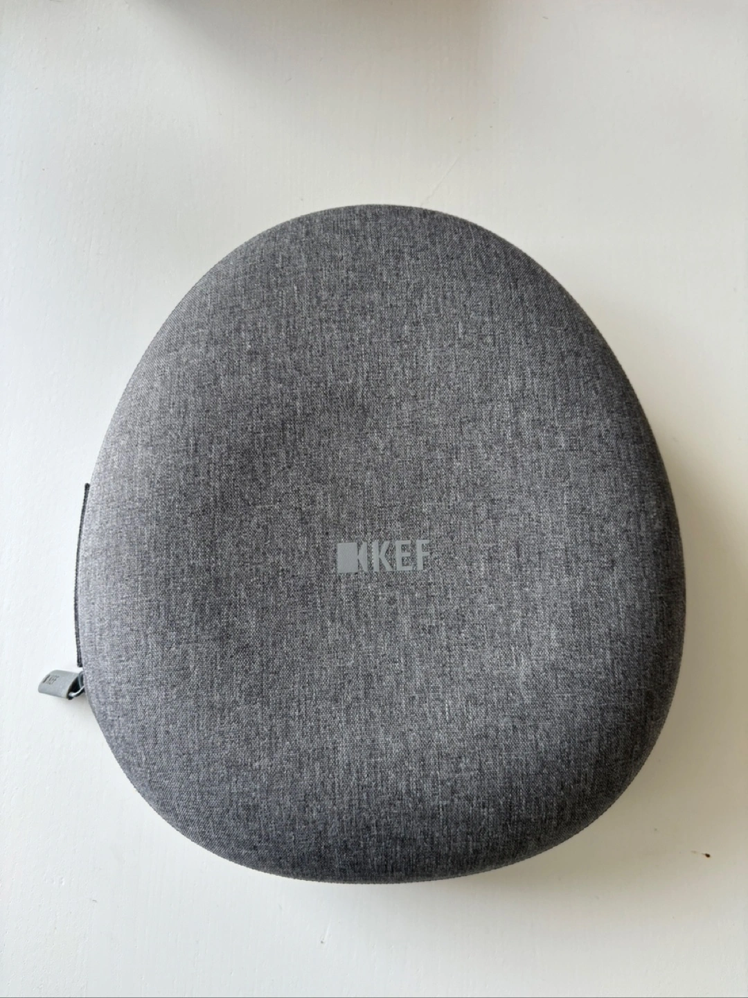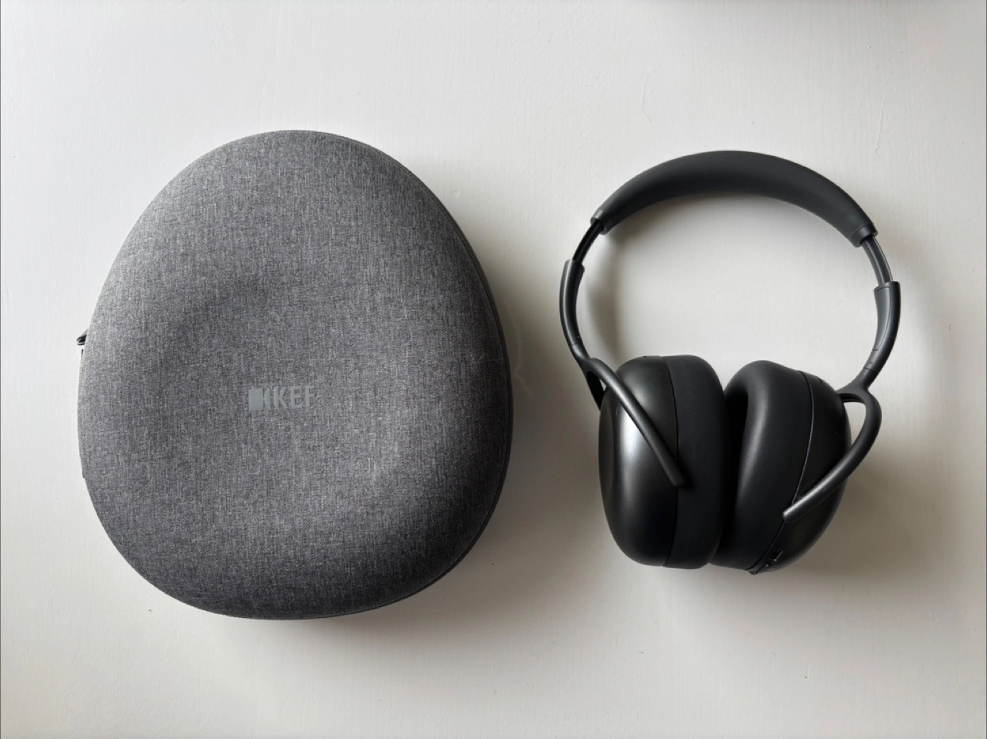 Headphones in a grey carrying case. Black headphones inside. The carrying case is grey with the KEF logo on it. Enjoy the serenity that these headphones can bring you.