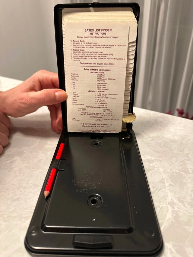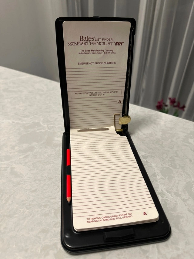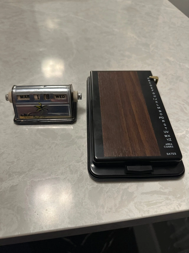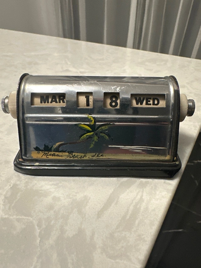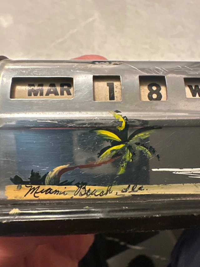 Vintage perpetual desk calendar from the 1940s or 1950s, featuring a painted scene of Miami Beach, made in Japan (Used). VTG Bates List Finder, used as a telephone index or address organizer (New).