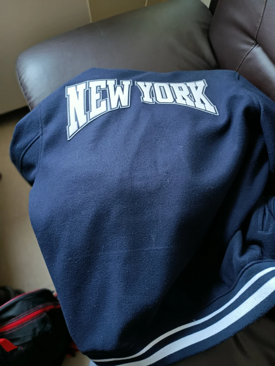 This is a navy blue varsity jacket with "New York" written across the back. It features New York Yankees patches on the front and has a striped collar and cuffs. A great jacket for any fan!