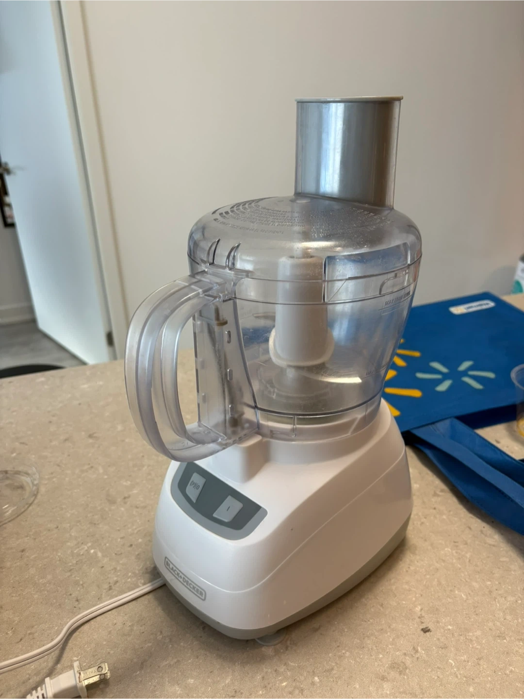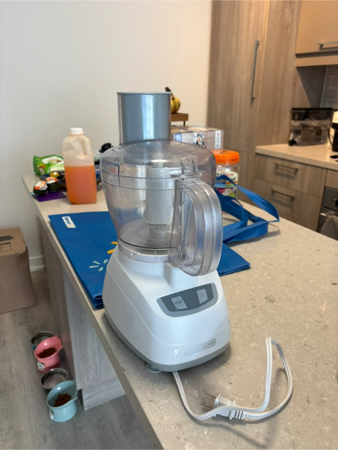 This is a compact BLACK+DECKER food processor. It has two speed settings and a pulse function. It's perfect for small chopping and mixing tasks in the kitchen.