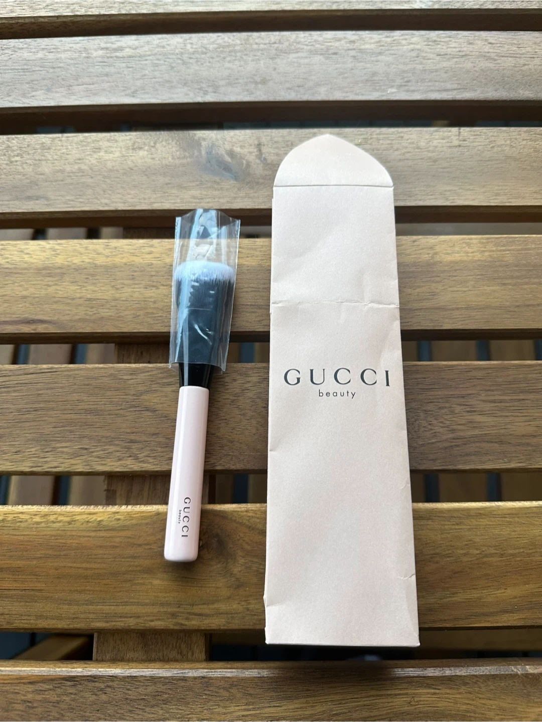 This is a Gucci Beauty makeup brush. It's made with 33% aluminium, 33% synthetic nylon, and 33% wood. The sleeve is made from FSC 120gsm white kraft paper. This brush is great for applying makeup!