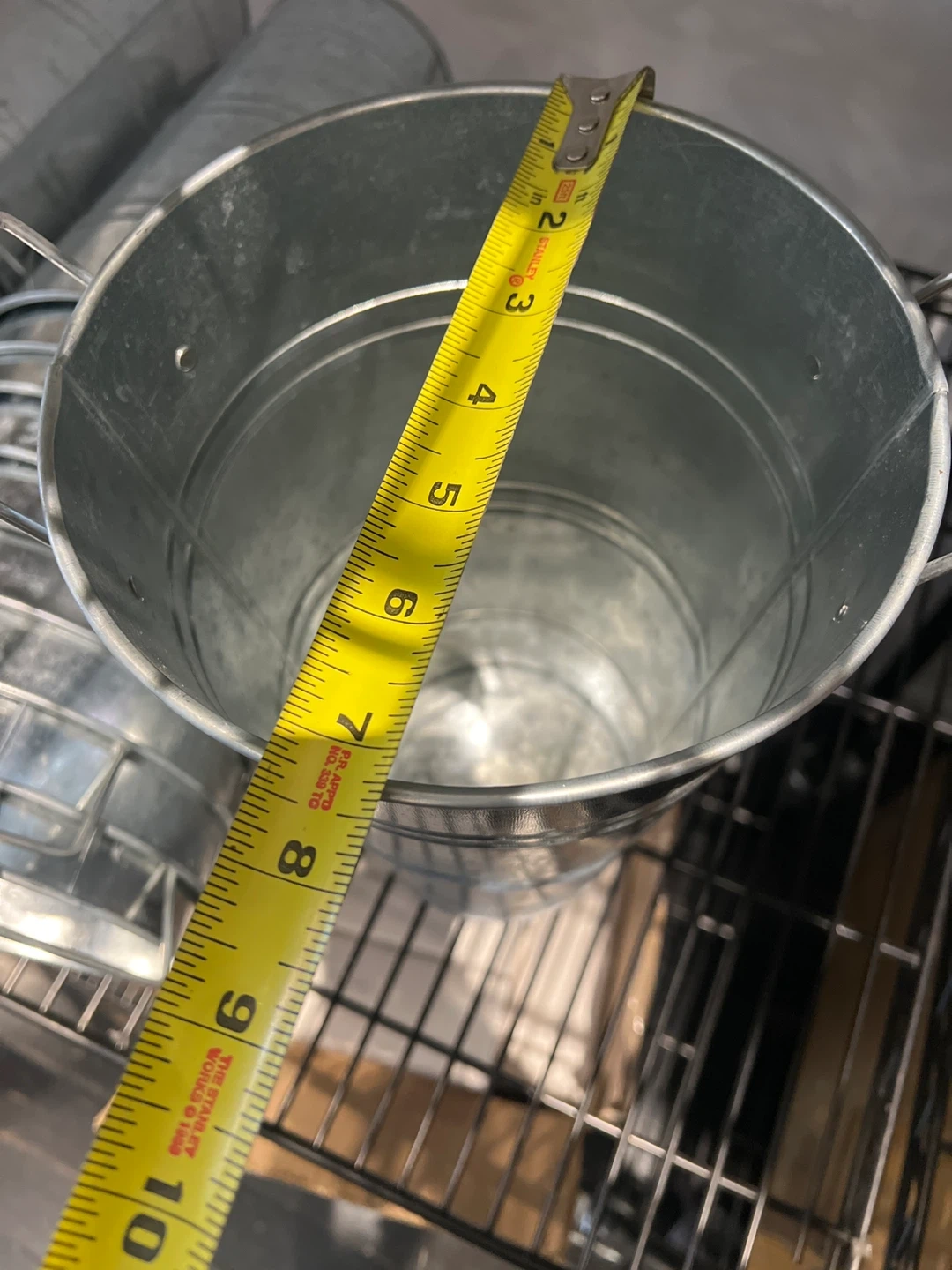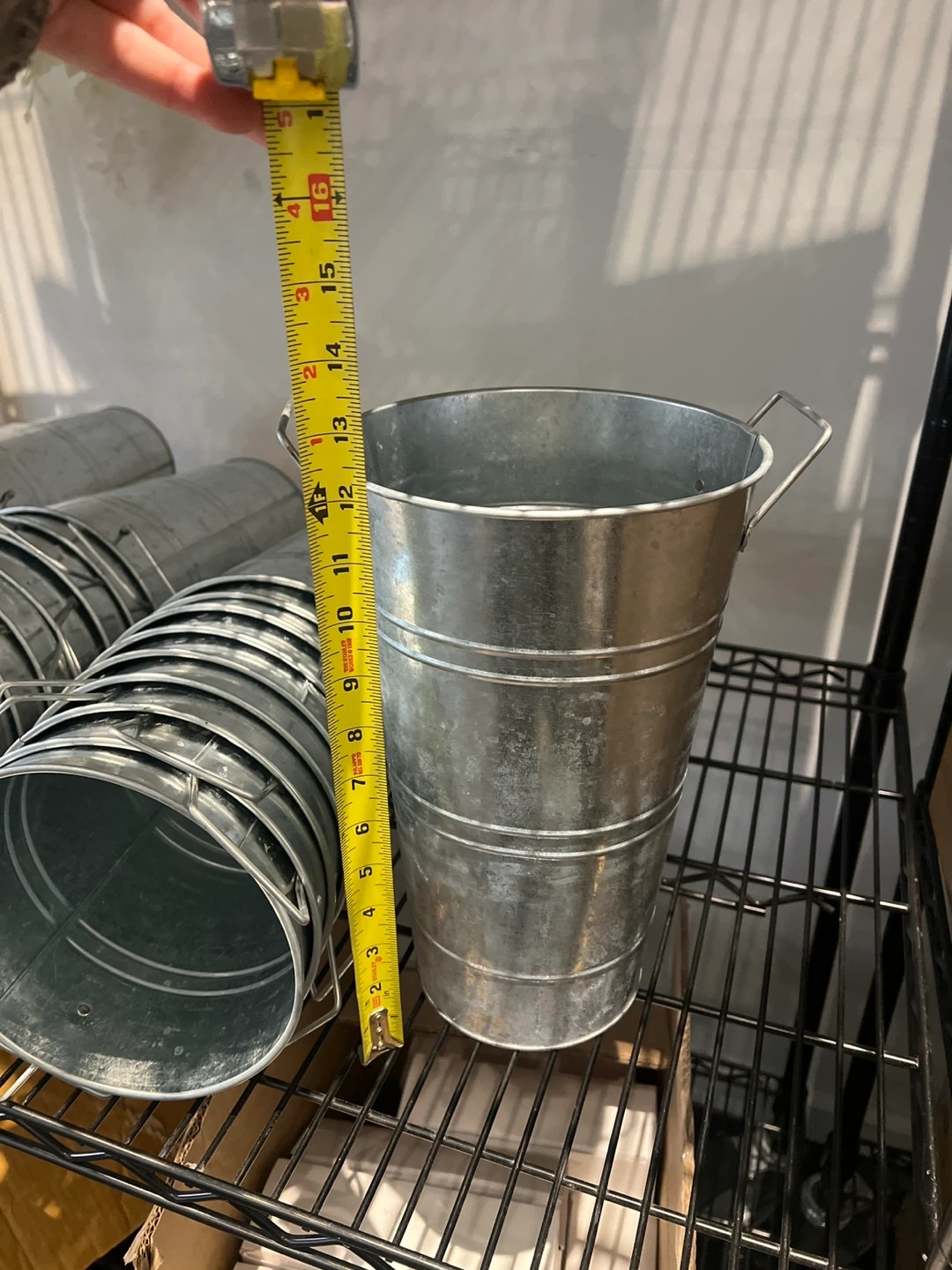Selling a set of 30 galvanized metal buckets! They're in great condition and perfect for various uses. Each bucket measures approximately 7.5 inches in diameter and 12 inches in height