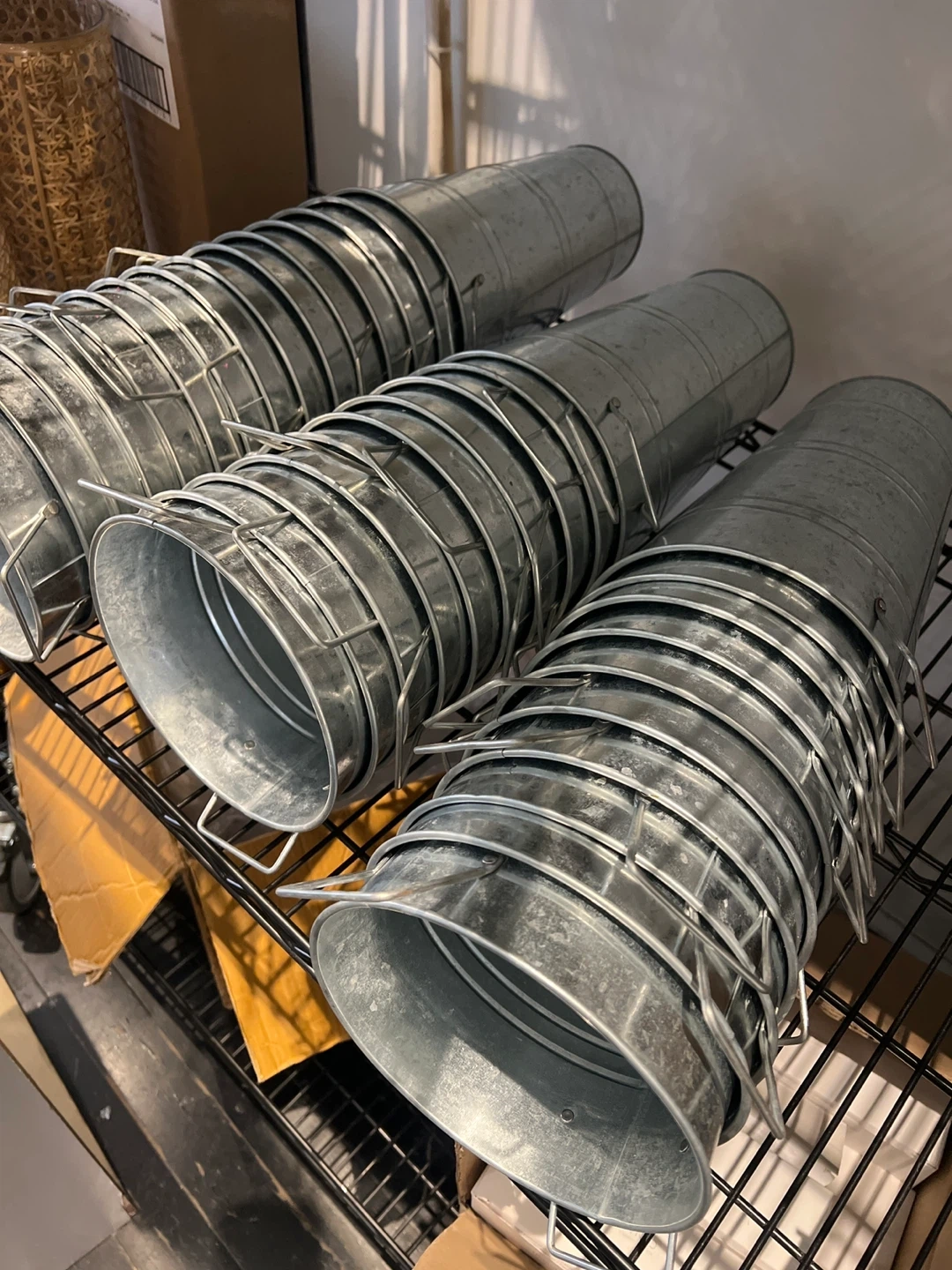 Selling a set of 30 galvanized metal buckets! They're in great condition and perfect for various uses. Each bucket measures approximately 7.5 inches in diameter and 12 inches in height