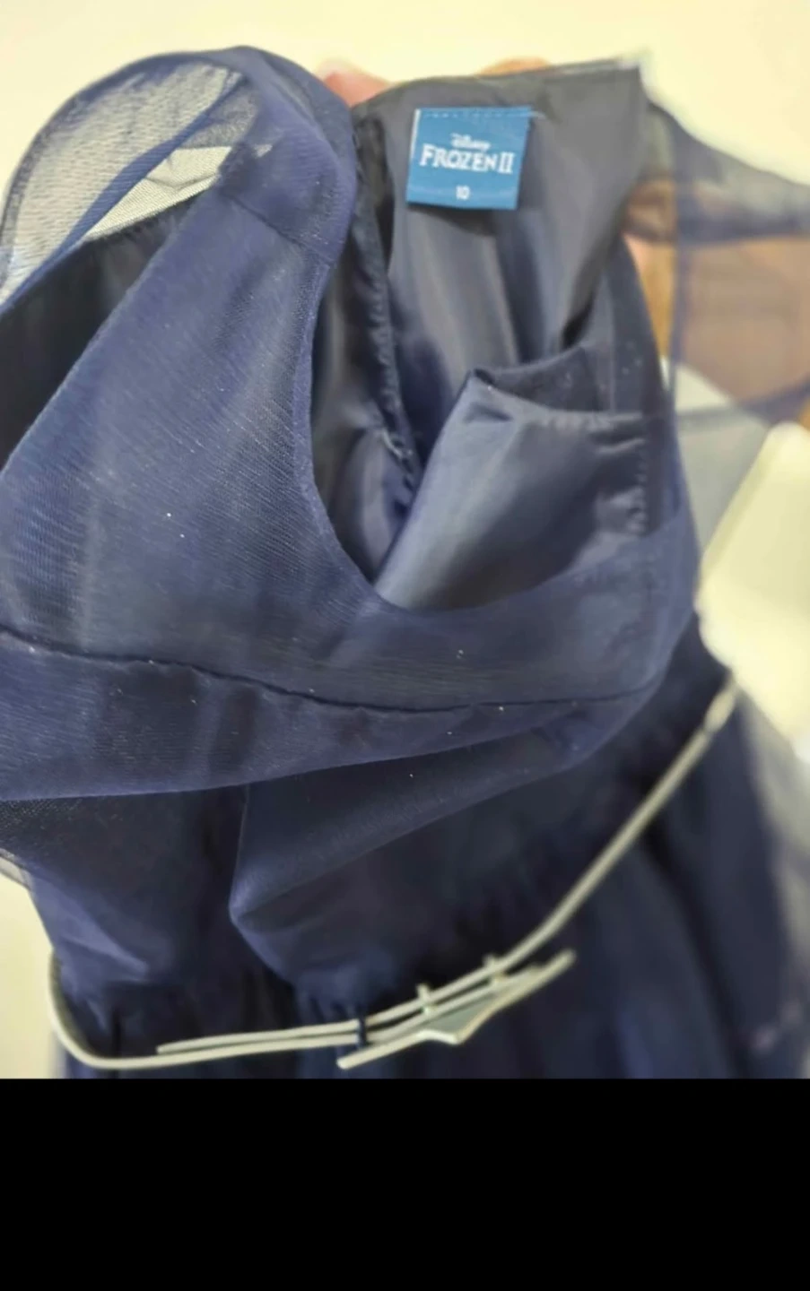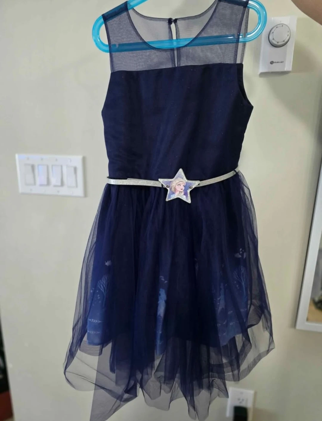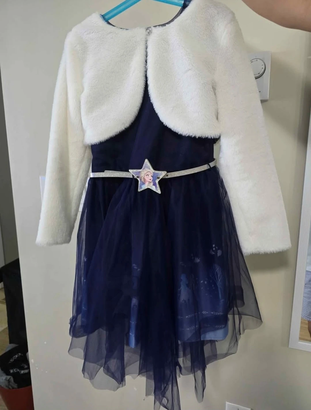 This lovely navy blue dress features a beautiful tulle overlay with a Frozen II theme. It comes with a white faux fur bolero jacket and a sparkly belt with an Elsa design. Size 10.