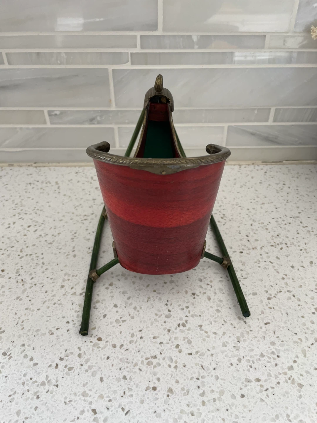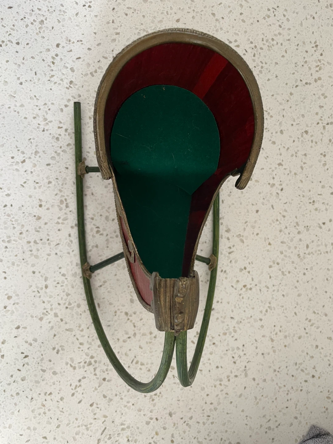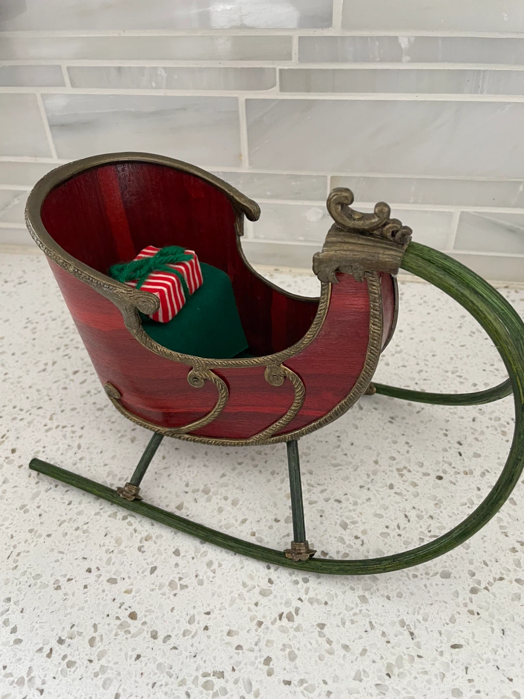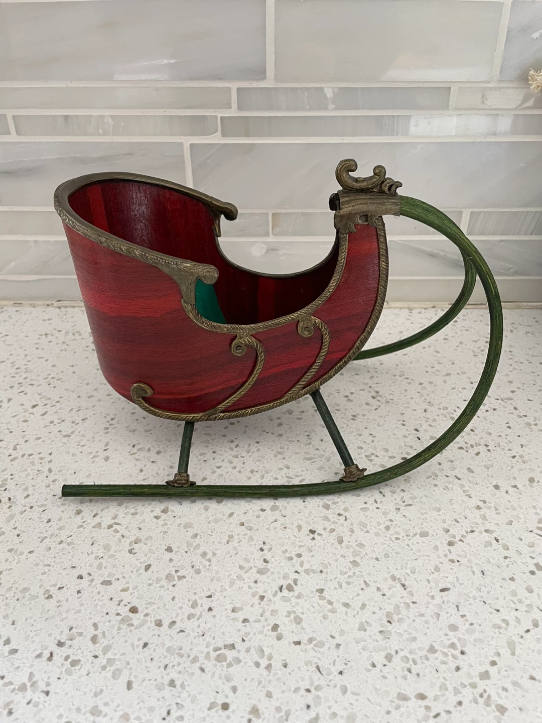 This is a charming Victorian Christmas Sleigh decoration. It features hand-laminated wood, hand-bent metal runners, and antique-plated metal trim. It's perfect for displaying holiday treats or small gifts!