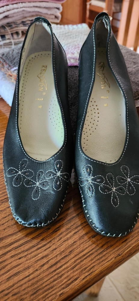 Selling a pair of Keldon black leather flats in size 40. They feature a cute floral design and are in good condition. Perfect for everyday wear!