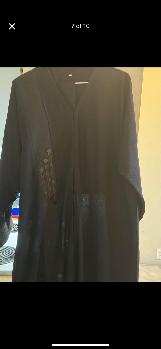 This is a black abaya with decorative embellishments on the front. It features a V-neckline and long sleeves. The material appears to be lightweight.