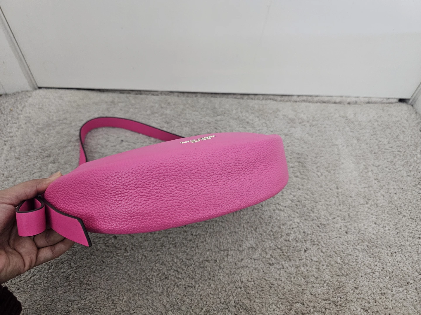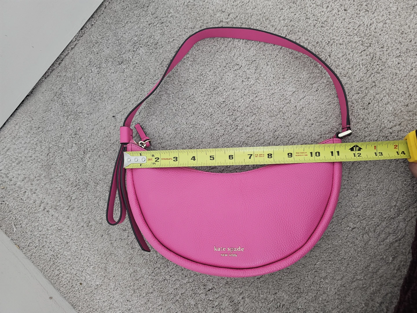 This is a Kate Spade New York crescent bag! It's a vibrant pink colour and made of leather. It's in great condition and ready for a new owner!