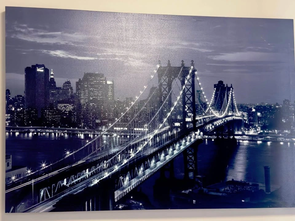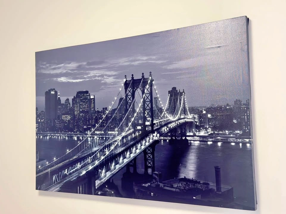 Stunning black-and-white canvas featuring a beautifully lit Brooklyn Bridge at night. Adds a modern, elegant touch to any living room, bedroom, or office space. High-quality print with sharp details and a sleek finish. Ready to hang.