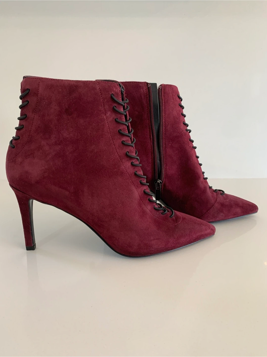 43Selling a pair of Kendall and Kylie burgundy suede lace-up booties in size 8.5. These stylish ankle boots feature a pointed toe and a stiletto heel. They have a unique lace-up design on the front and a zipper closure on the side. Perfect for adding a pop of colour to your outfit!