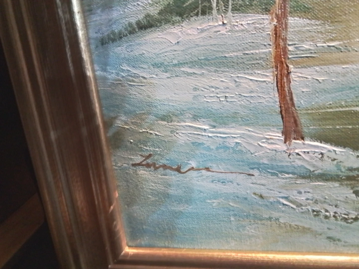 Oil on canvas painting of a winter cabin scene. Features a snow-covered landscape with trees and a rustic cabin near a frozen body of water. It's signed by the artist, 'Lenue'. Ready to hang with a gold-toned frame.