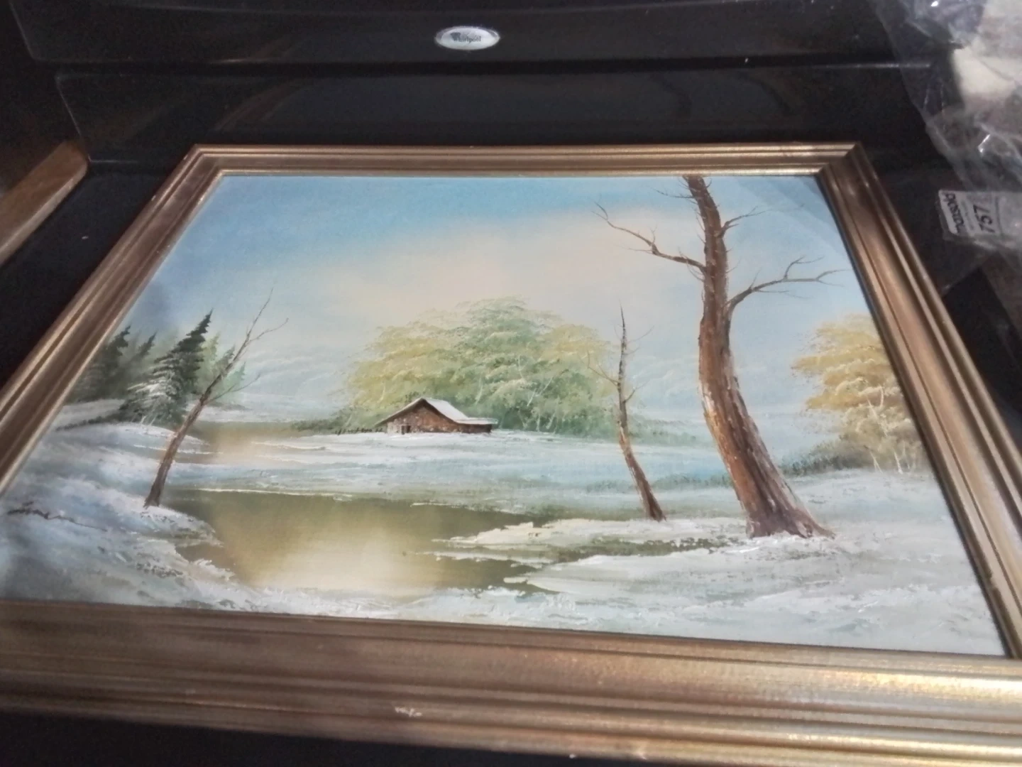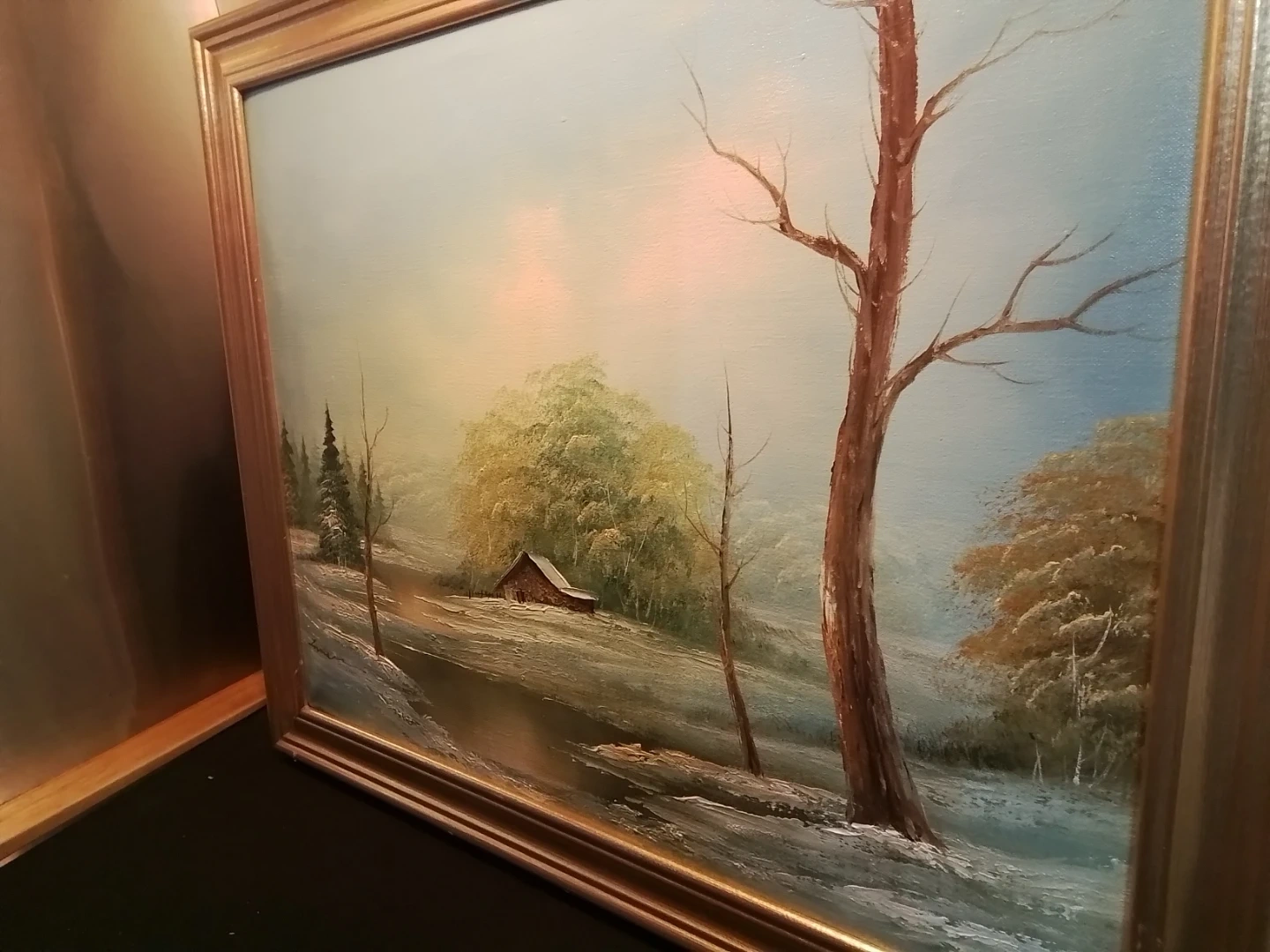 I'm offering an original winter landscape painting, signed by the artist. This serene piece captures a tranquil winter scene with a cabin near a frozen pond. The painting is oil on canvas (OOC) and measures 23.25 inches by 19.5 inches. The use of colours brings a peaceful, cold feeling to the piece, suitable for any room needing a touch of calm.