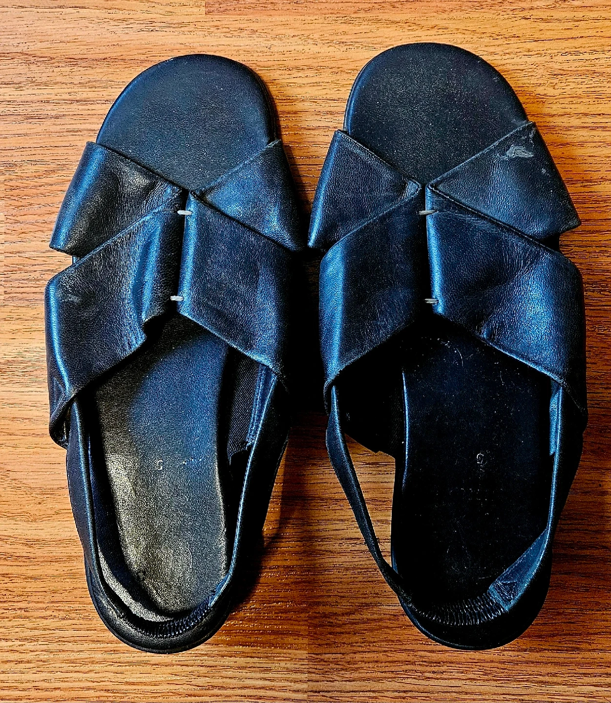 1000+Selling a pair of Kenneth Cole black leather sandals in size 5. They're in good condition and have a unique criss-cross strap design. The soles show some wear, but they're still very comfortable for everyday wear! From a smoke-free, pet-free home. Bundle discounts are available—feel free to browse my other listings. Thanks for looking! 😊🙏
