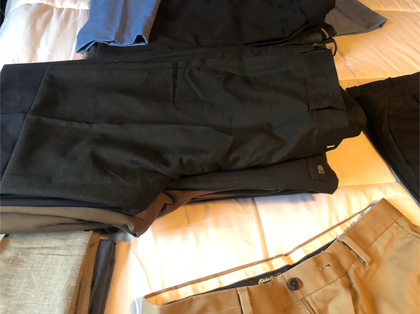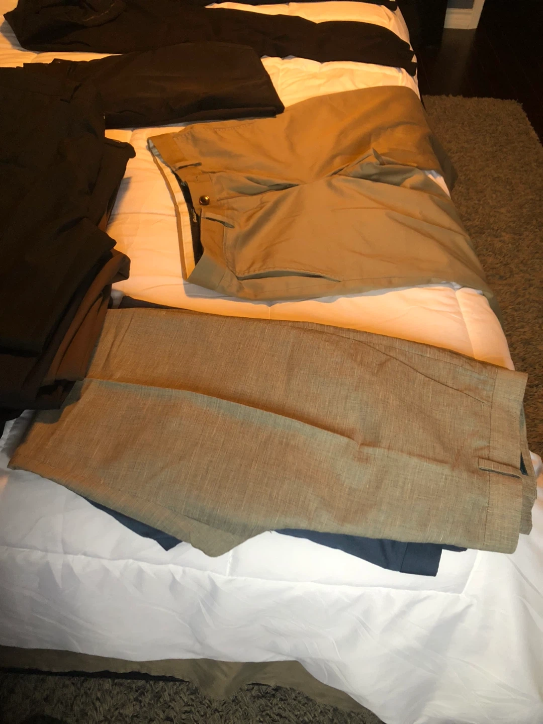 31Men dressy pants: Eddie Bauer 35*34 size 3Perry Ellis 34* 32 Haggar 34* 30 size Ralph Lauren waist 32 large size 2 Haggar 36*30 size Haggar comfort 36*32 size 4Kenneth Cole reaction 36*30 size Kelvin Klein 36*30 size Dockers 36*30 size Vanheusen 36*30 size Slim fit 36*32 size $20 dollar each