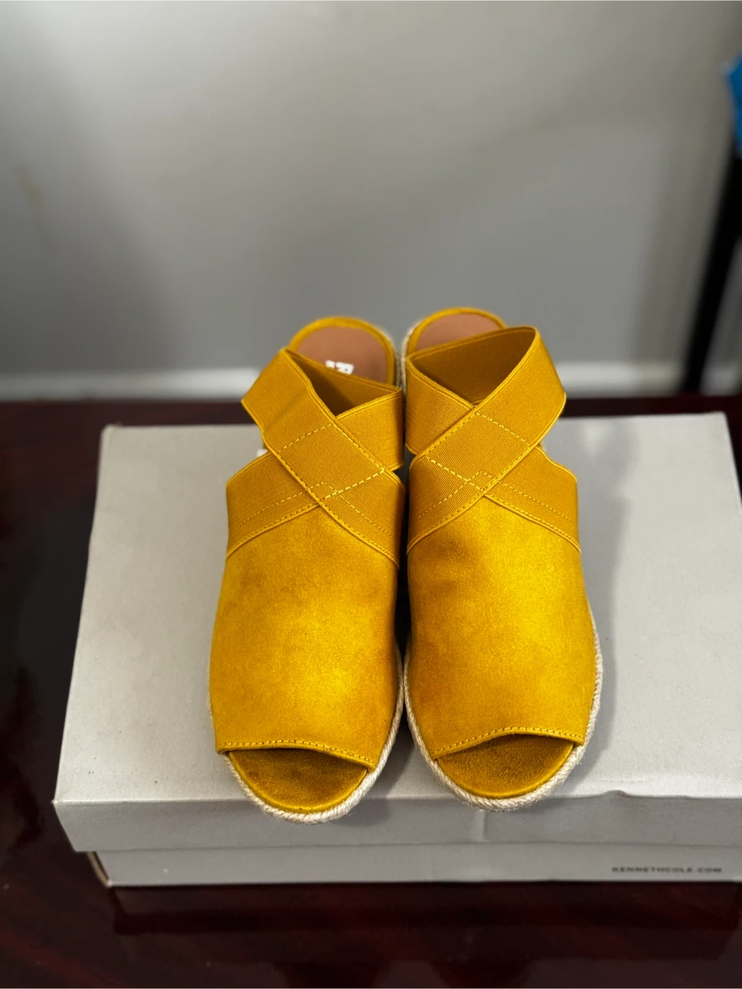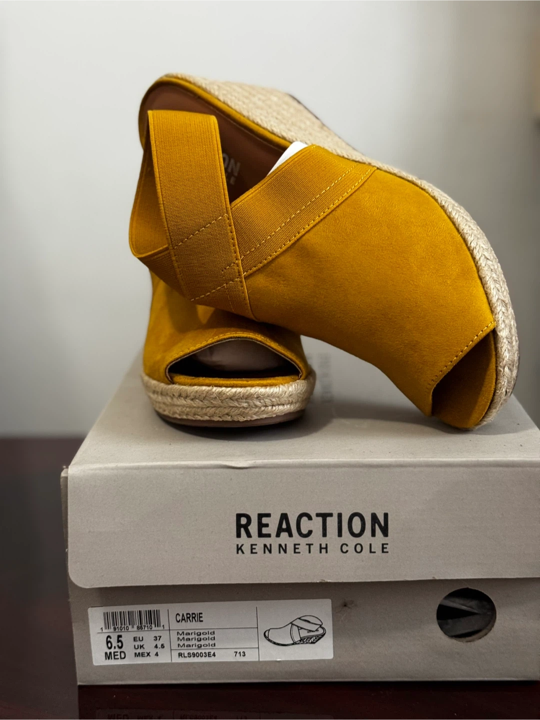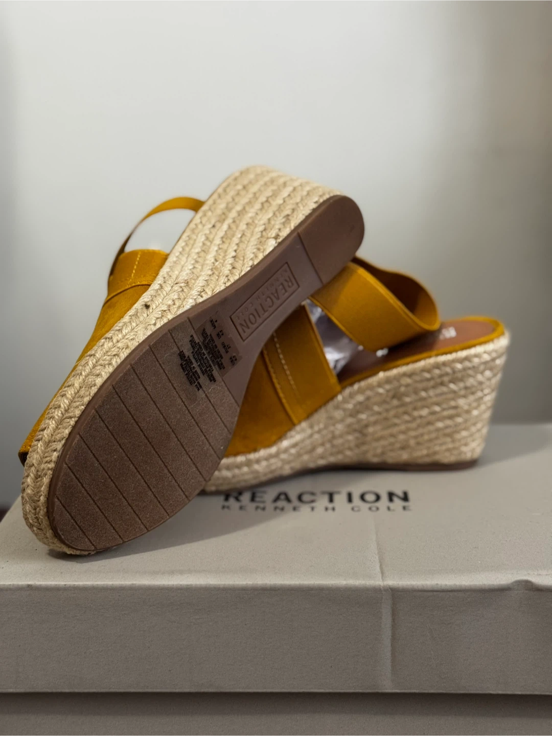 75These are a pair of Kenneth Cole Reaction 'Carrie' wedge sandals in a marigold yellow colour! They're a women's size 6.5 and come in the original box