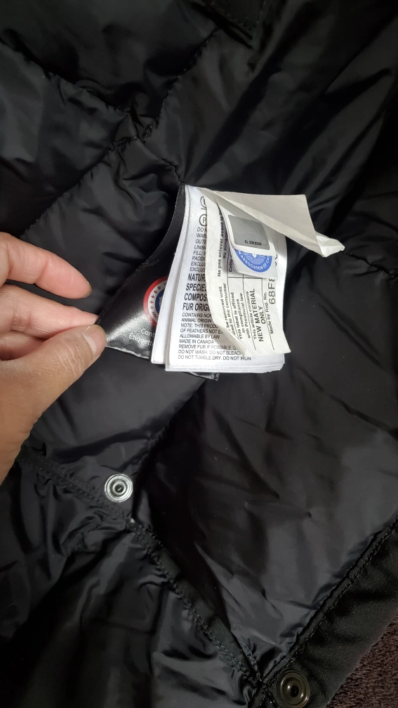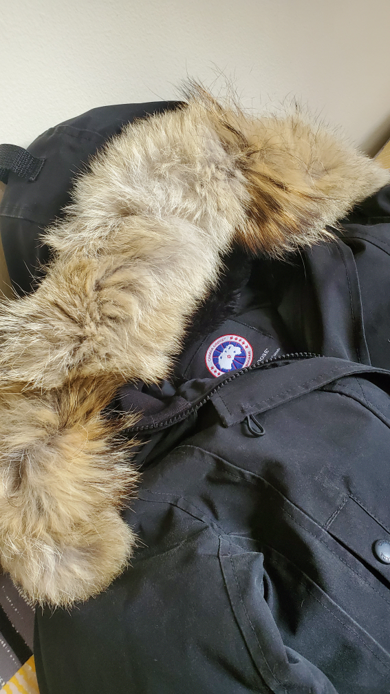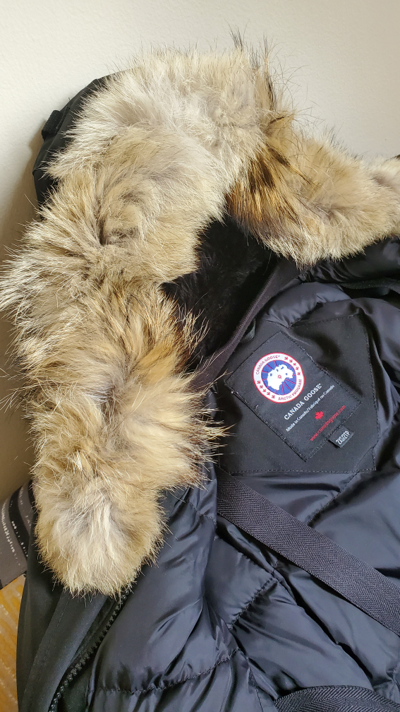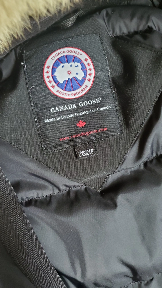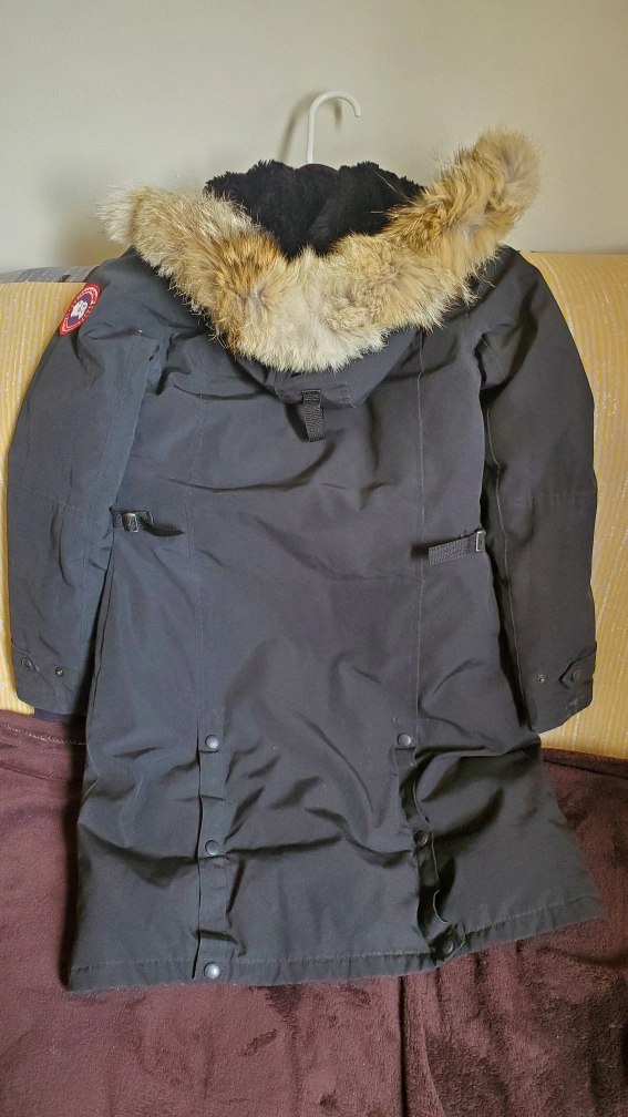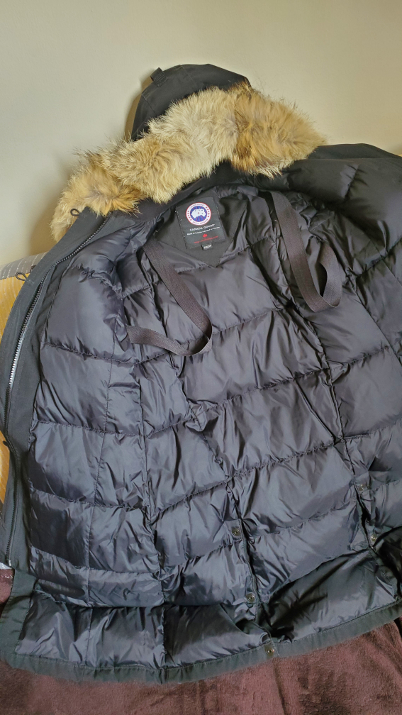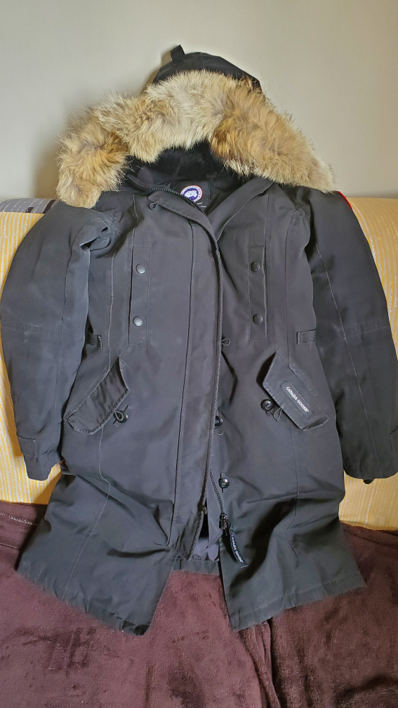 This is a Canada Goose Women's Parka. The jacket is black with a fur-lined hood. It is in good condition.