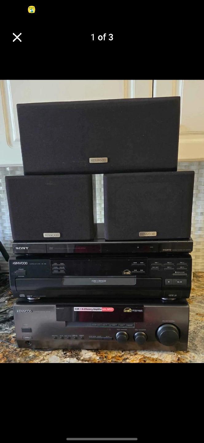 10Selling a Kenwood stereo system. Includes the speakers, amplifier, CD player and tape deck. Great for someone looking for a vintage audio setup! Home entertainment system good sound. Some skuffs at the footing. As is. Surround speakers Dvd player Receiver 5 Disk CD changer player