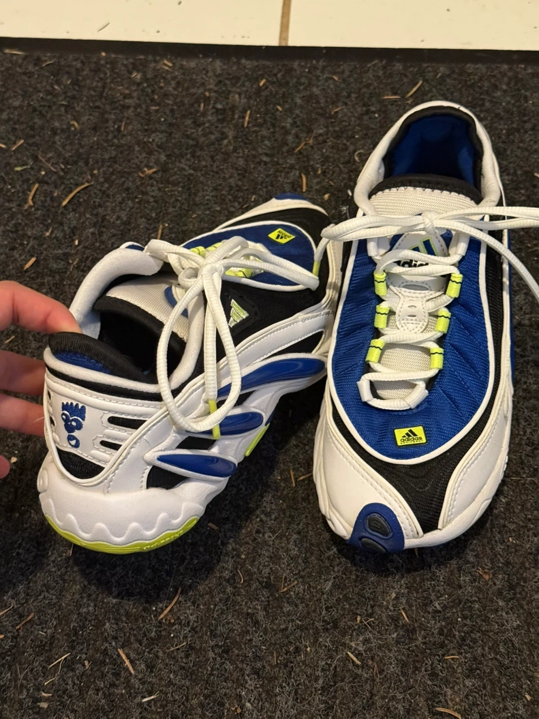 A pair of Adidas sneakers in white, blue, and black. They're laced up and ready to go. These shoes feature a comfortable design.