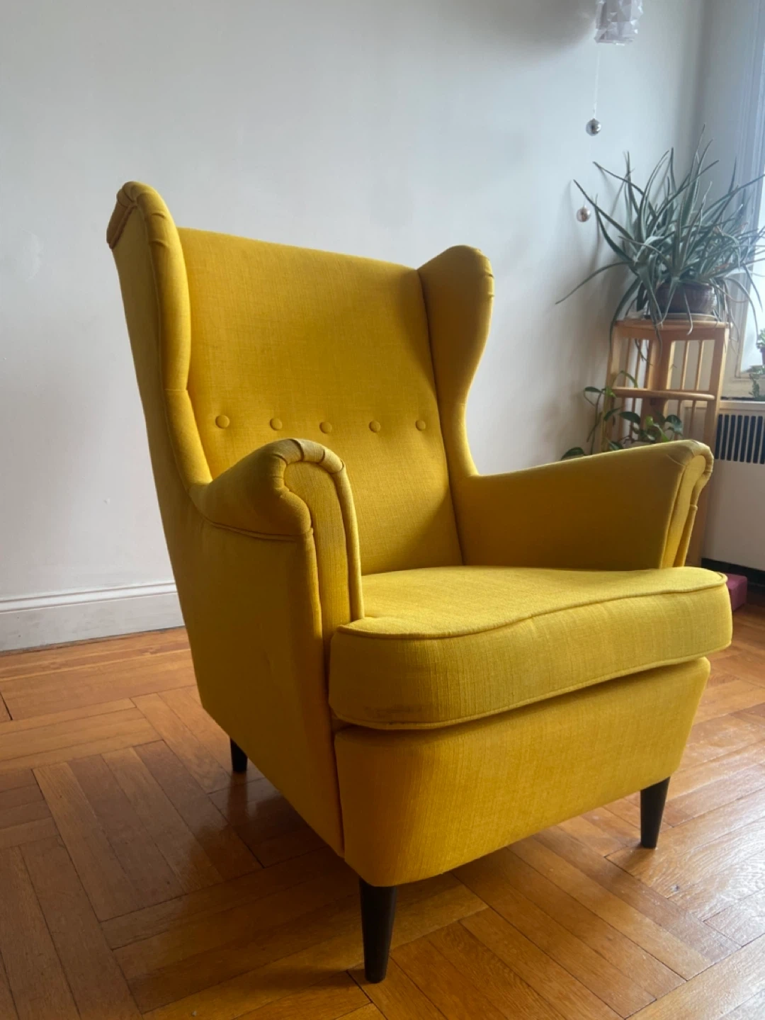 Ikea yellow upholstered wingback armchair with a matching ottoman. The set features button tufting on the backrest and tapered wooden legs. This comfortable chair and footrest combo is ready to brighten up your living space!