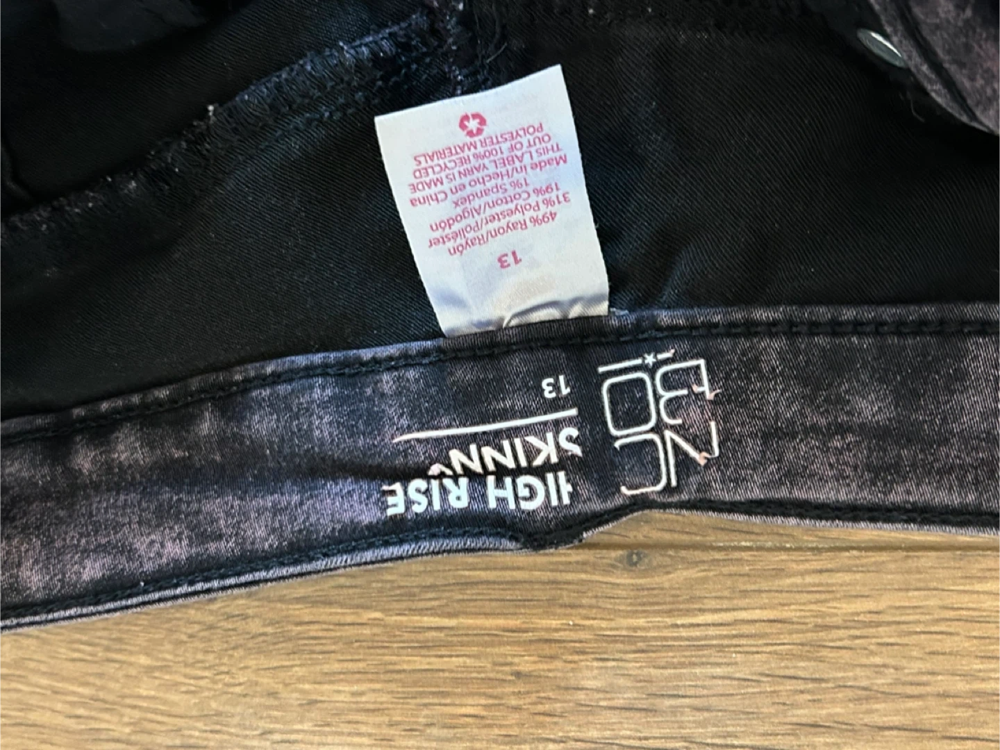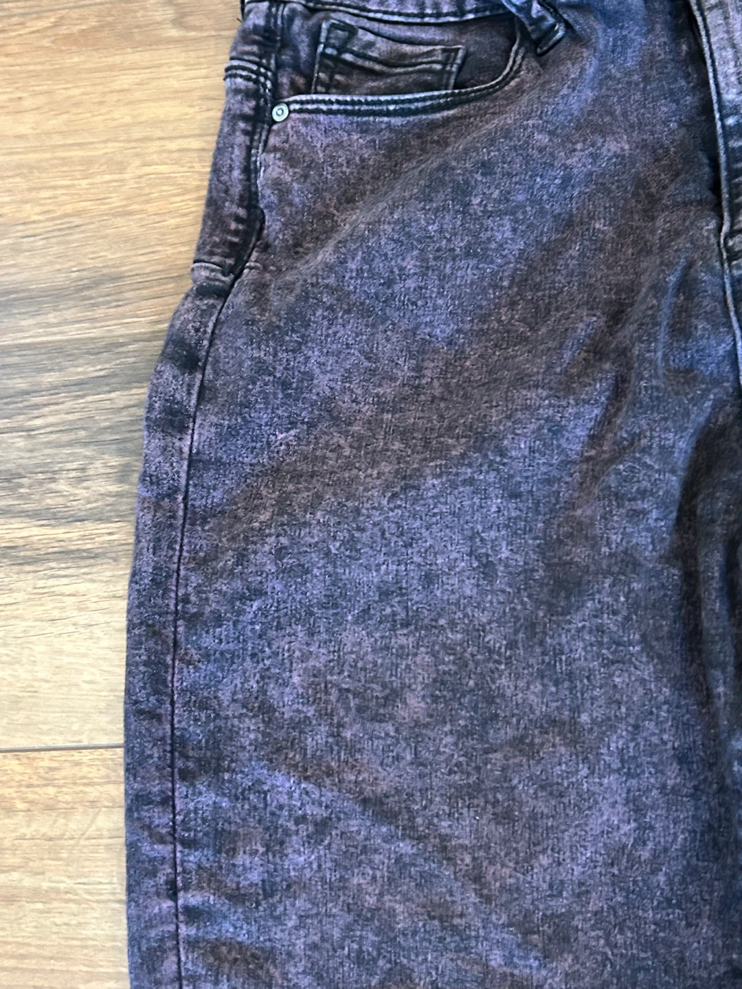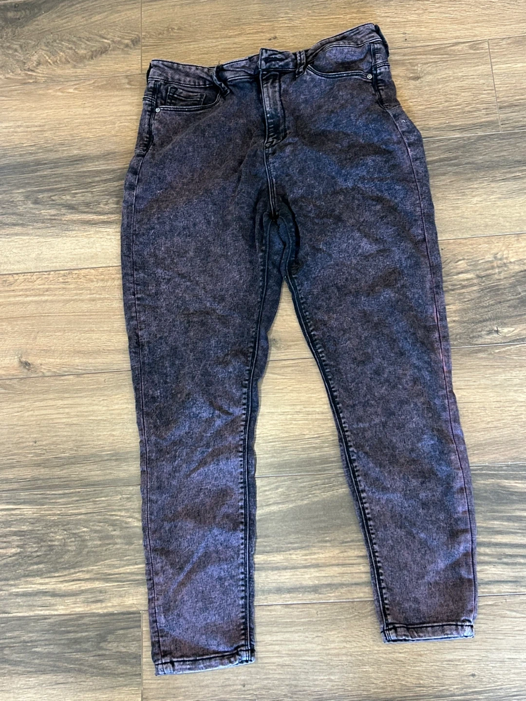 These No Boundaries jeans are high rise and skinny fit. They're a size 13 with a cool acid wash purple and black pattern. Made from 69% cotton, 31% polyester.