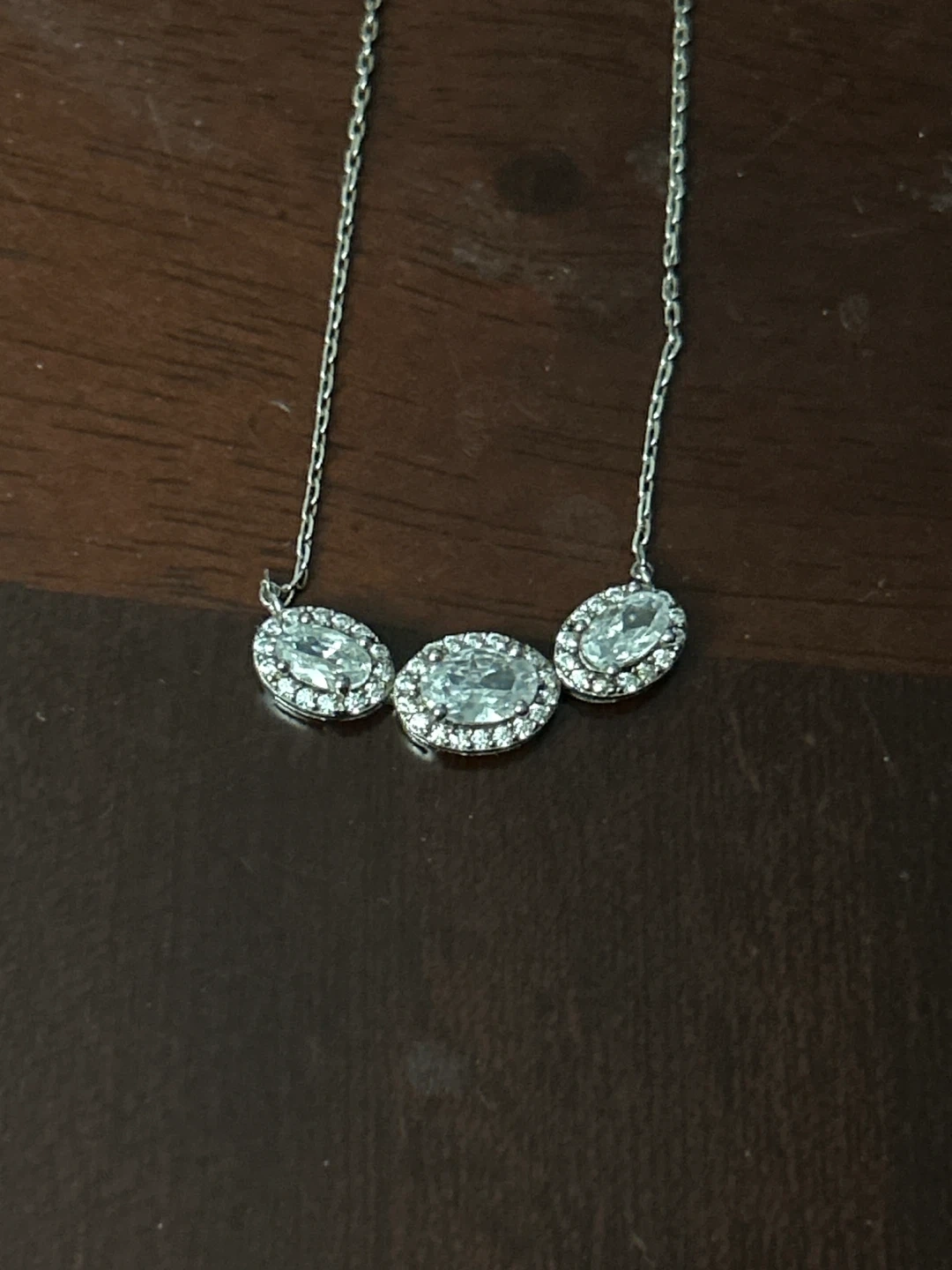 This silver necklace features three oval-shaped crystals set in a line. The metal is marked "S925" indicating sterling silver. It's a classic piece for everyday wear or special occasions.