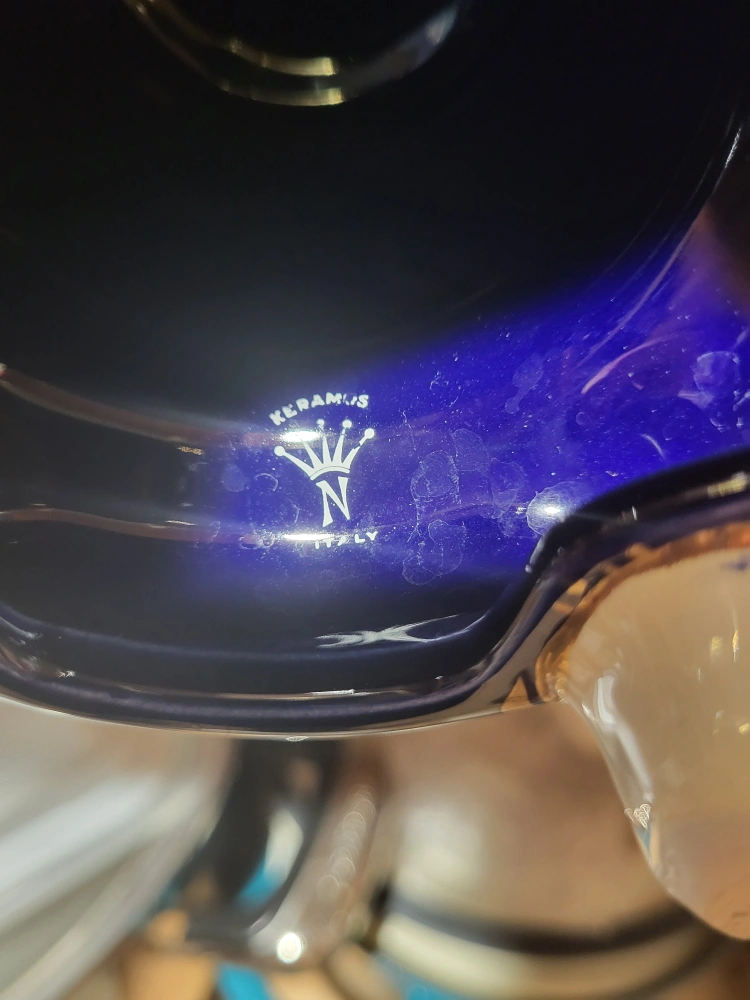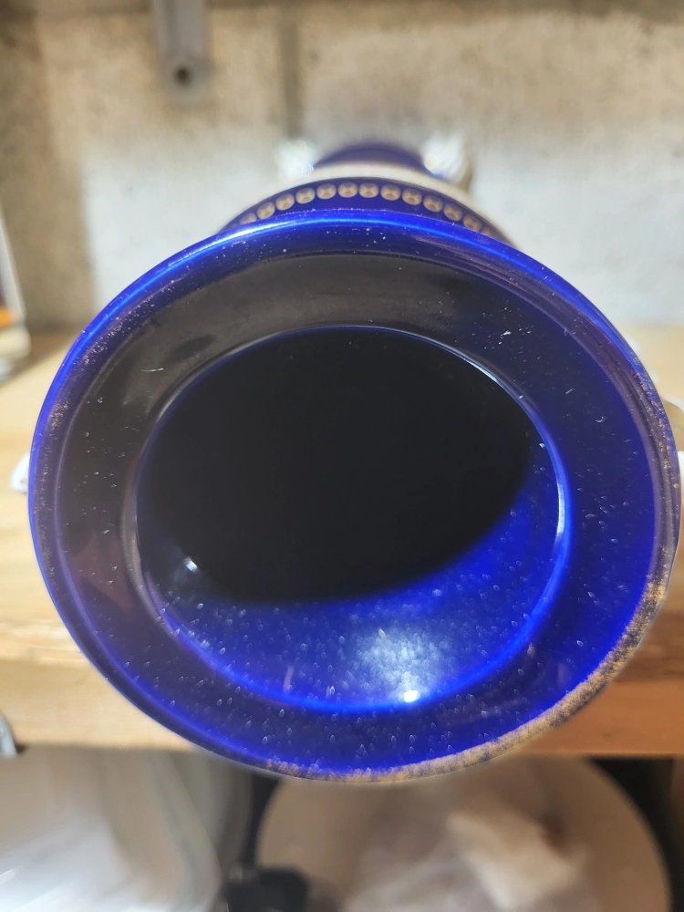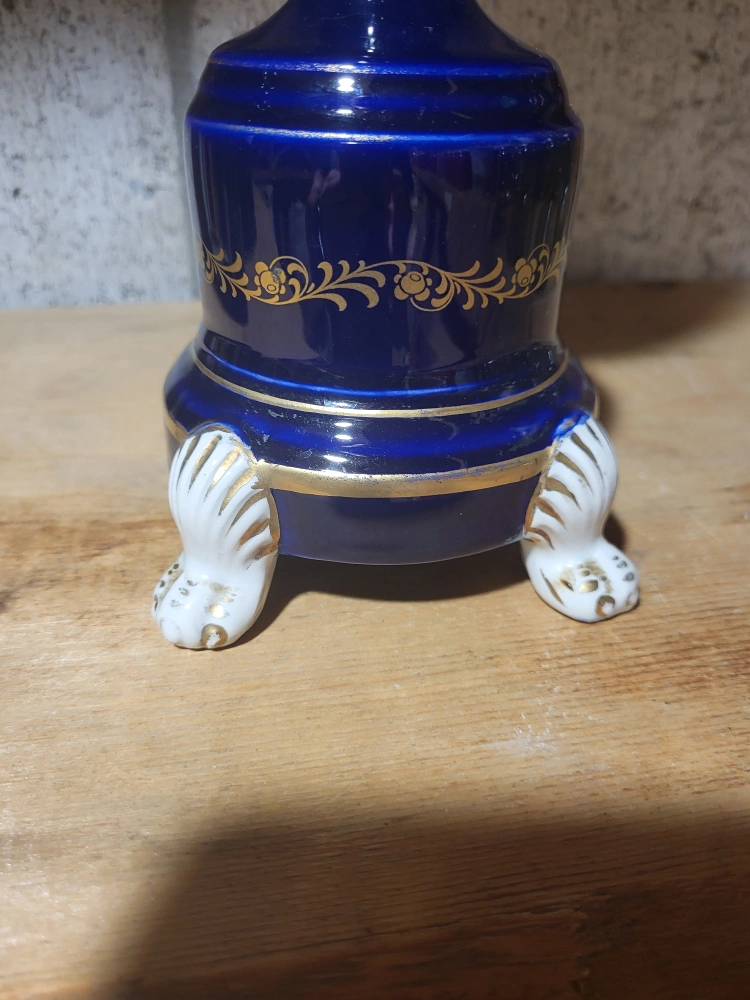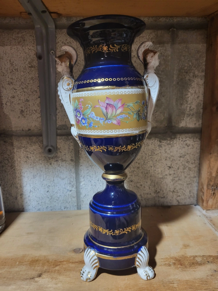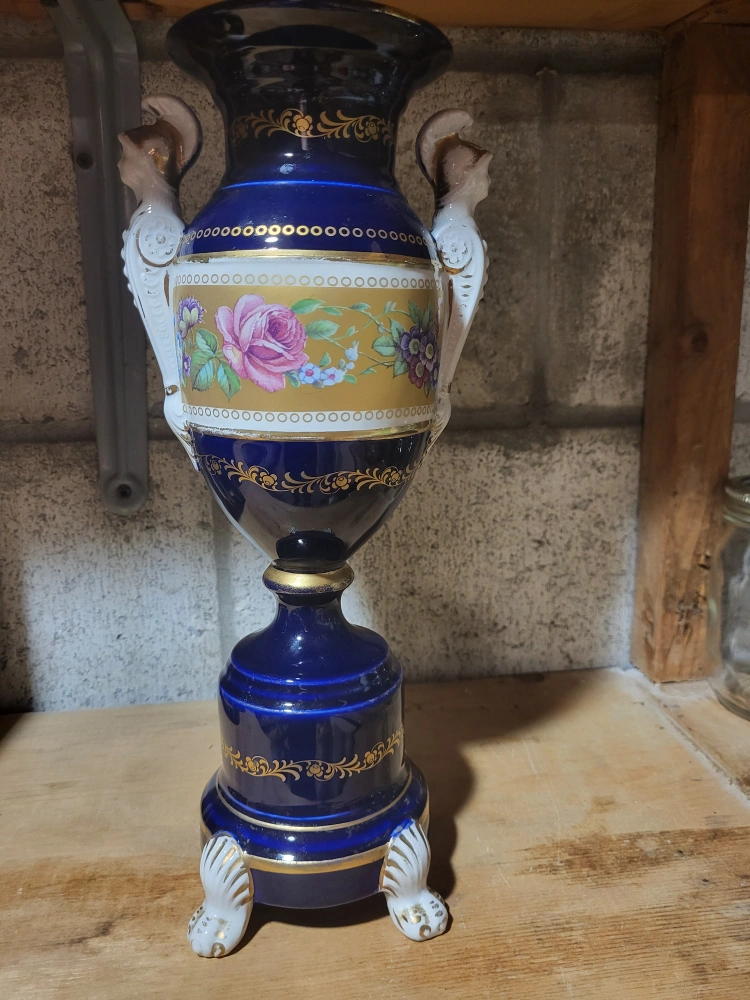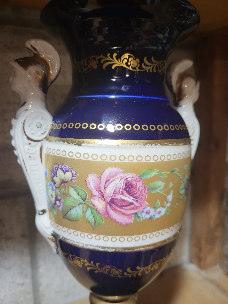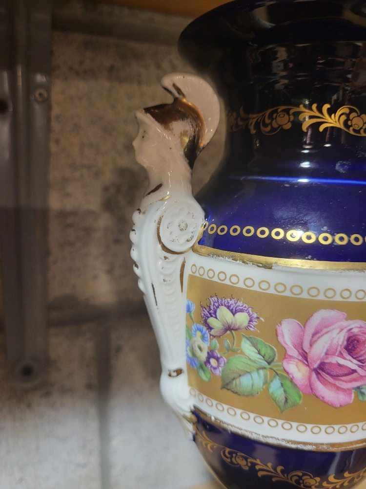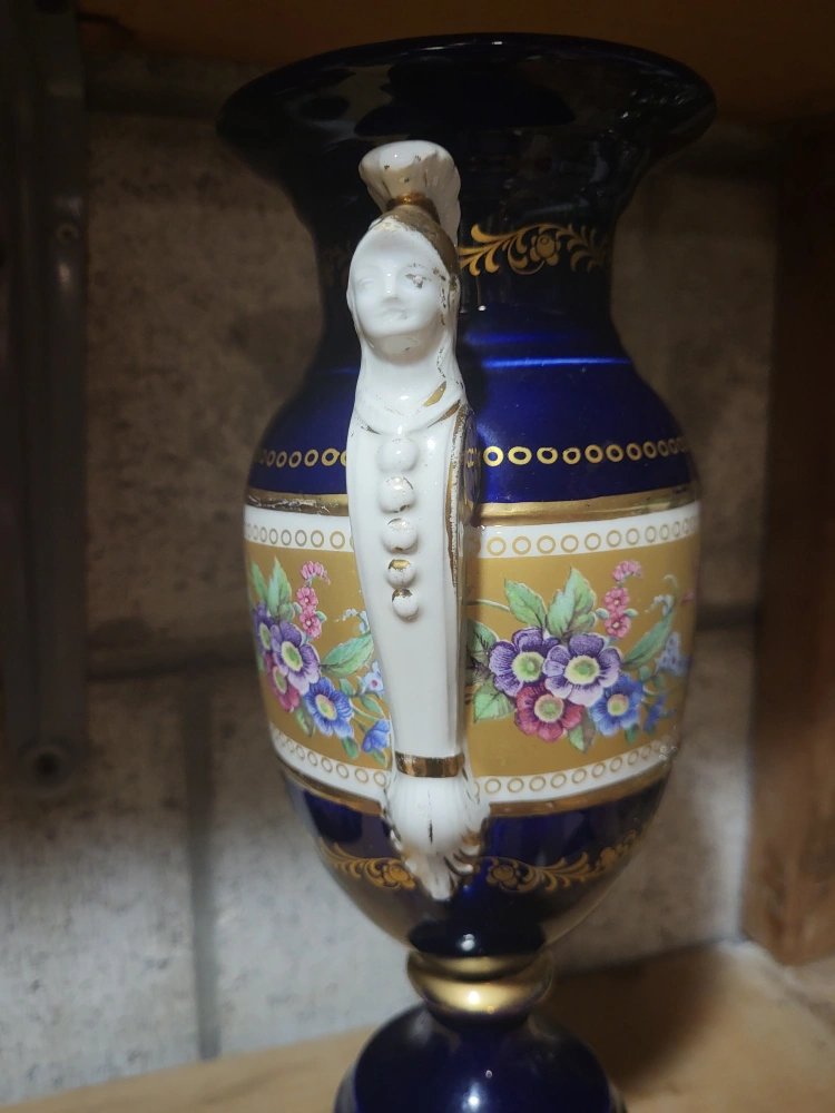 86Beautiful decorative vase in a striking blue and gold colour scheme! It features intricate floral patterns and unique handles shaped like figures. A lovely piece to add a touch of elegance to any room!