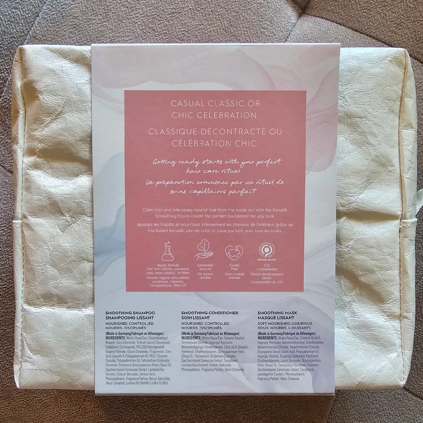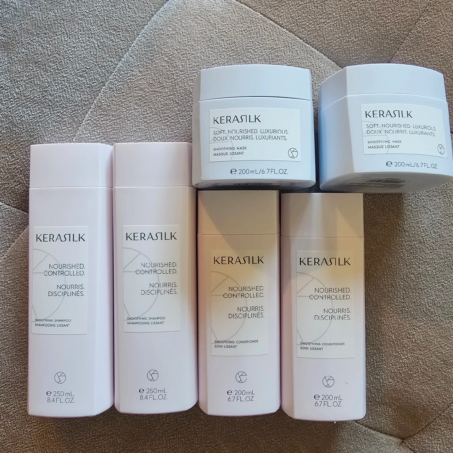 65Tame unruly hair and bring on the shine with this luxurious Kerasilk Smoothing Set. Designed to smooth, soften, and control frizz while leaving hair touchably sleek. 💆♀️ What’s Included (Full Sizes): 🧴 Smoothing Shampoo – 8.4 fl oz (Retails at 40$!) Gently cleanses while starting the smoothing process from the first wash. Leaves hair manageable and nourished with Kerasilk’s signature scent. 🧴 Smoothing Conditioner – 6.7 fl oz Detangles, softens, and smooths the hair fiber for long-lasting frizz control and sleekness without weighing the hair down. 🧖♀️ Smoothing Mask – 6.7 fl oz (Retails at 45$!) Deeply nourishes and repairs the hair while sealing the cuticle for intense smoothness, shine, and humidity resistance. Ideal for weekly use. 🌟 Why You’ll Love It: • Salon-level smoothing care at home • Great for thick, coarse, frizzy, or color-treated hair • Reduces blow-dry time and makes styling easier • Luxurious, clean scent and soft finish • Perfect for gifting or upgrading your own routine 🎁 Brand new, sealed, and sold as a complete set only.