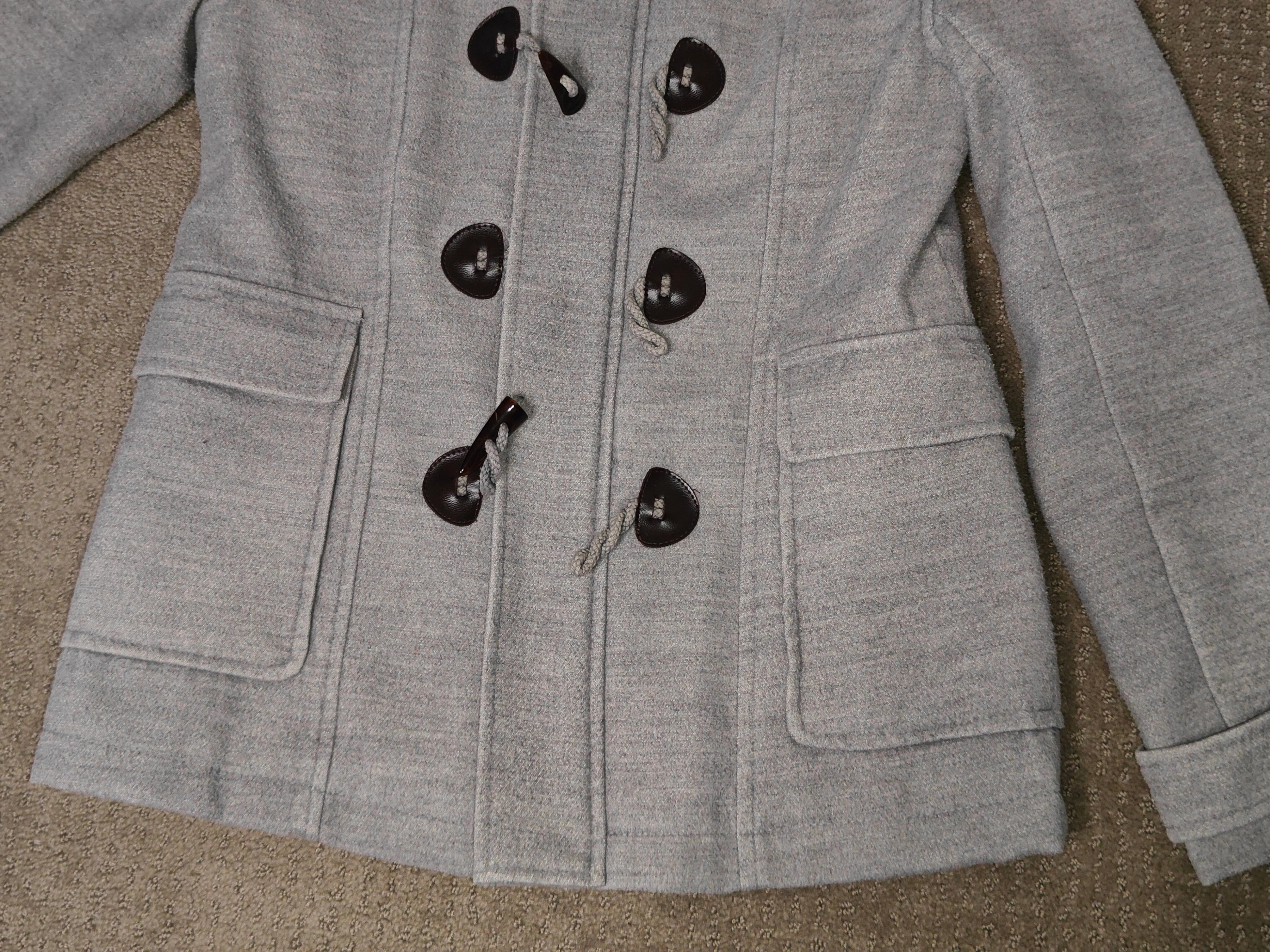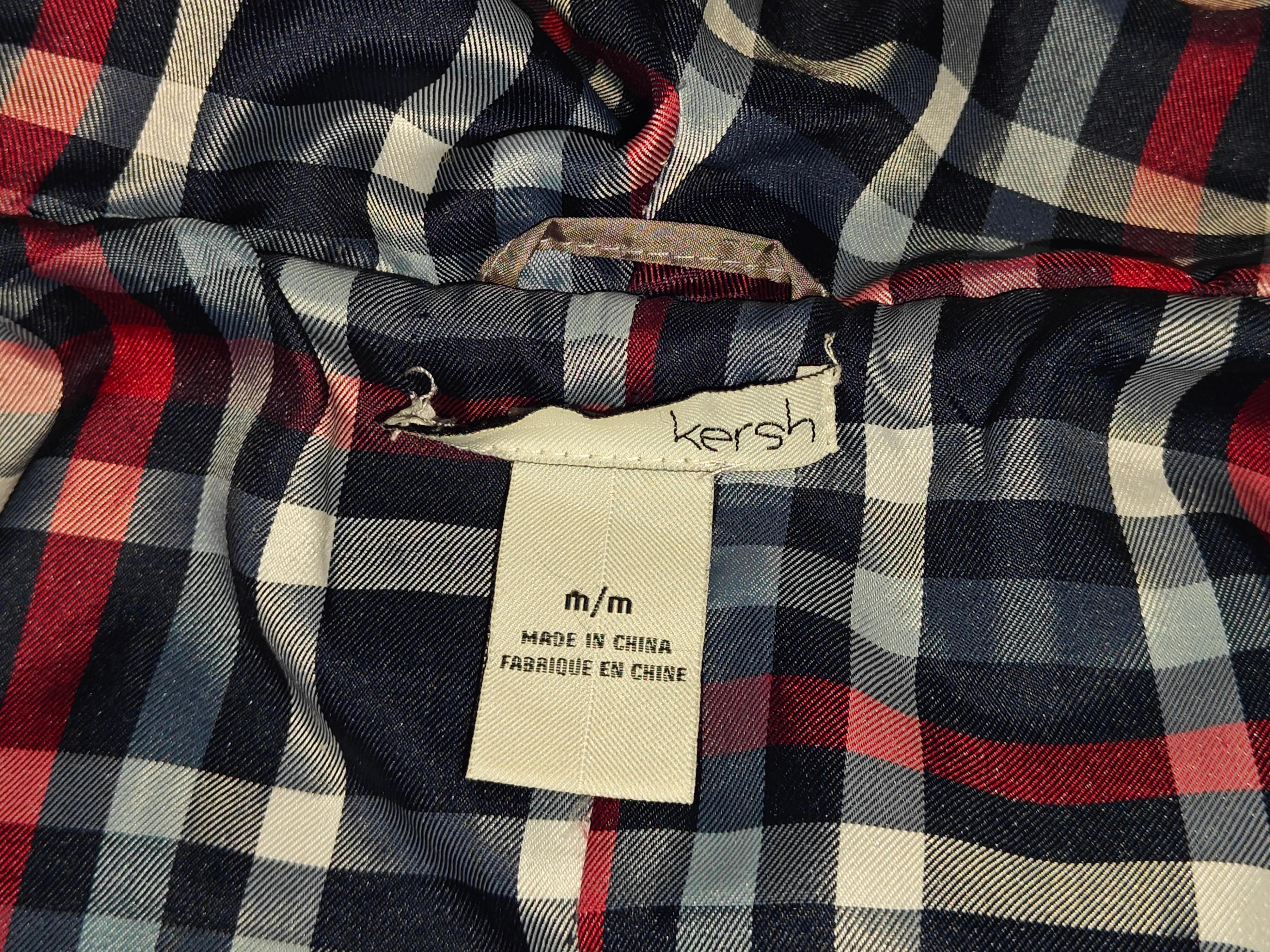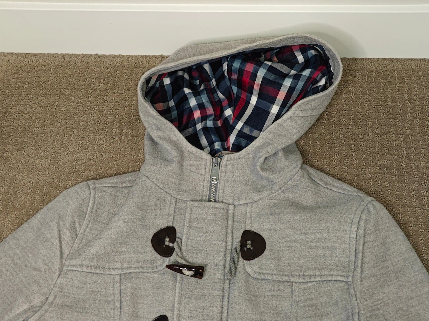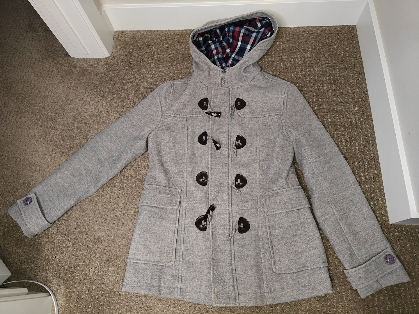 I am selling a Kersh Women Grey Hooded Duffle Coat / Peacoat Jacket with Plaid Lining in used, good condition. This is a stylish and warm women's hooded coat from the brand Kersh. It’s a great piece for fall and milder winter weather. The classic duffle coat design is elevated with a fun, vibrant red, white, and navy plaid lining that shows nicely in the hood and when the coat is open. The coat is in good, used condition with no visible issues or damage. It has been well-cared for and is ready for its new owner. Key Features & Style: * Colour: Light Heather Grey / Oatmeal with a textured "marled" look. * Lining: Vibrant navy, red, and white plaid. * Closure: Full zip-up front, covered by a placket with four decorative toggle buttons (dark brown with horn-style toggles and loops). * Hood: Attached hood with the plaid lining. * Pockets: Two large, functional flap pockets at the hips and one small one on the inside. * Sleeves: Long sleeves cuffs secured by a single purple button. * Fit: Mid-thigh length (depending on your height). * Designed in Canada * Style # KA 18000 * Machine Washable Measurements (Approximate) * Size: Women's Medium * Sleeve (Shoulder to Wrist): 24" * Shoulder to Shoulder: 16" * Bust (pit-to-pit): 18" * Total Length (Bottom Collar to Bottom Edge): 26" Shell Fabric Material Content (as per tag): * 89% Polyester * 10% Viscose * 1% Spandex Lining Fabric Content (as per tag): * 100% Polyester Comes from a pet and smoke-free environment. Pickup in Mount Pleasant (NW Calgary)