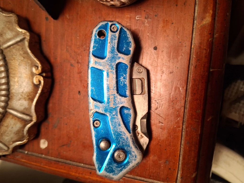 Selling a Kershaw folding pocket knife. It has a blue handle with a silver blade. It shows signs of use but is still functional. No blades included.