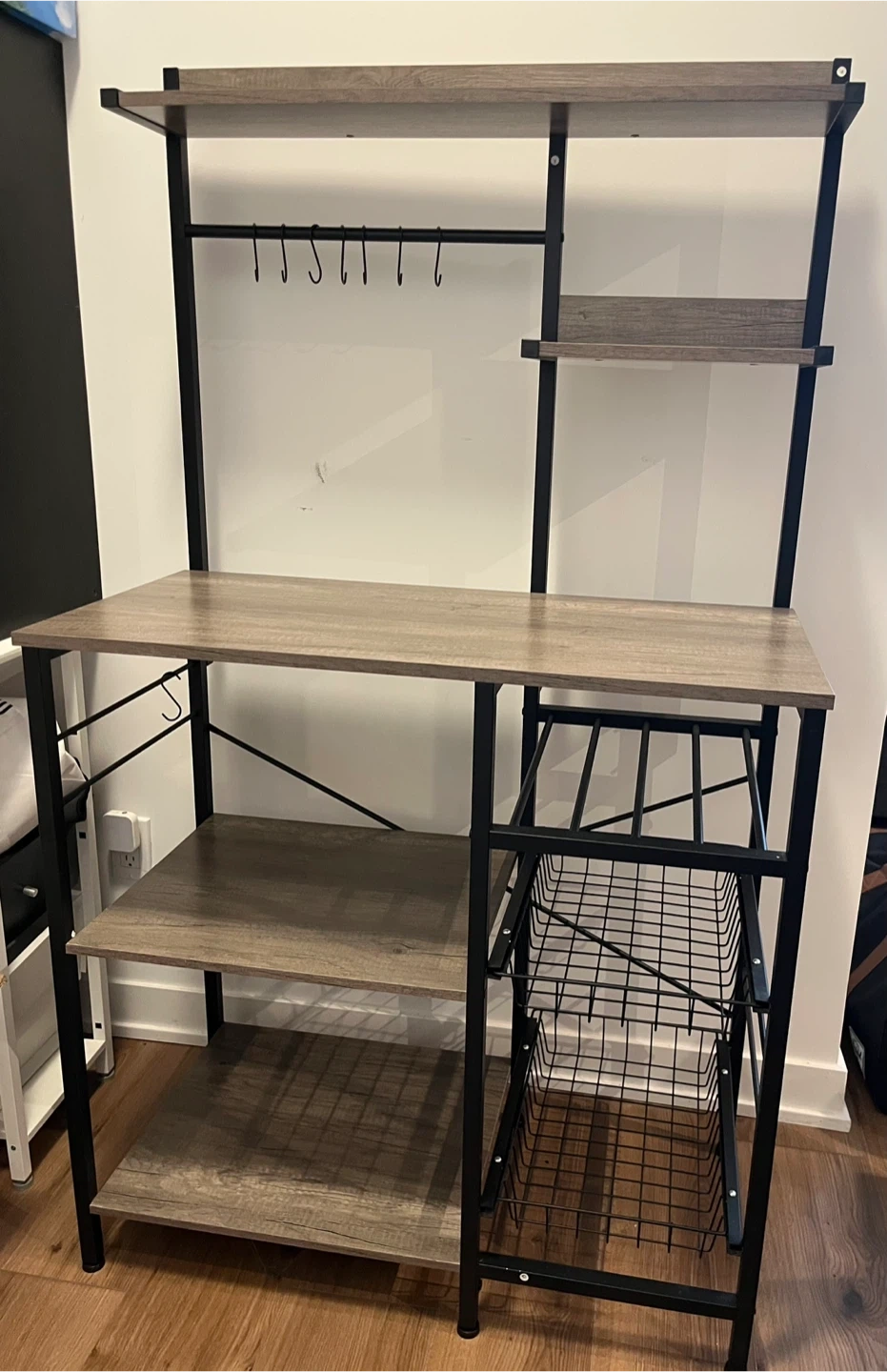 This rack is perfect for adding extra storage and style to your kitchen! It features a sturdy metal frame with shelves, providing ample space for your microwave, dishes, and other kitchen essentials. The rack also includes hooks for hanging mugs or towels. The dimensions are shown in the images.