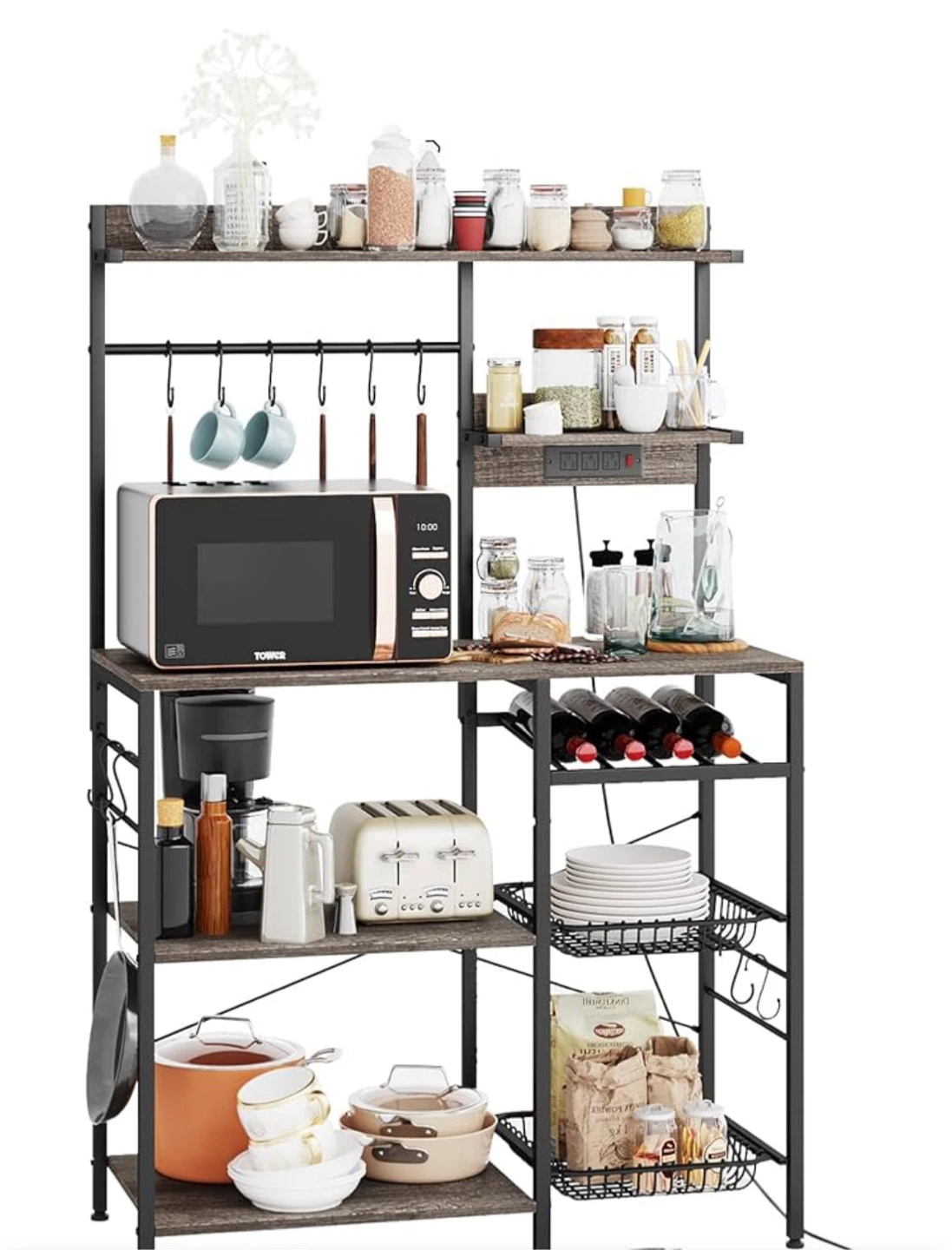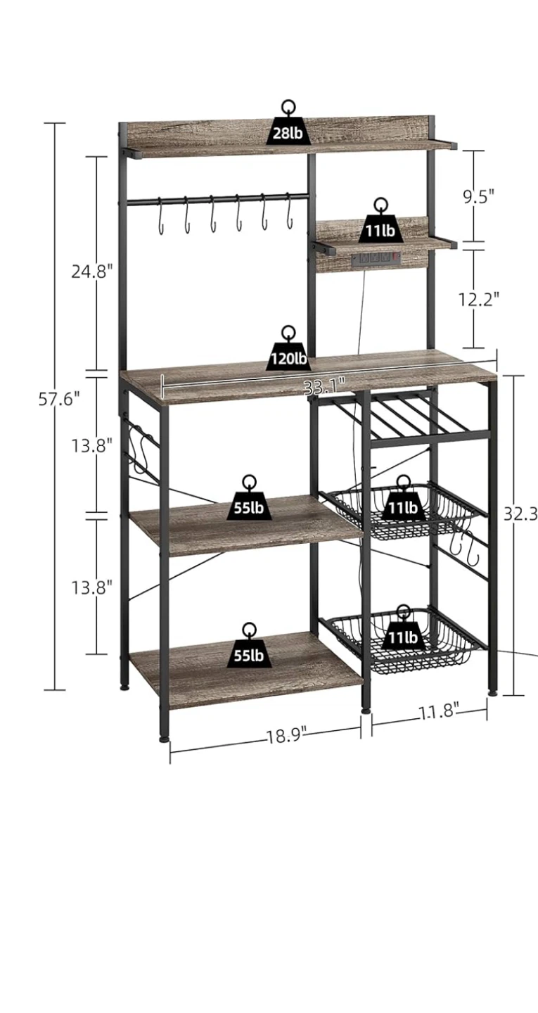 This rack is perfect for adding extra storage and style to your kitchen! It features a sturdy metal frame with shelves, providing ample space for your microwave, dishes, and other kitchen essentials. The rack also includes hooks for hanging mugs or towels. The dimensions are shown in the images.