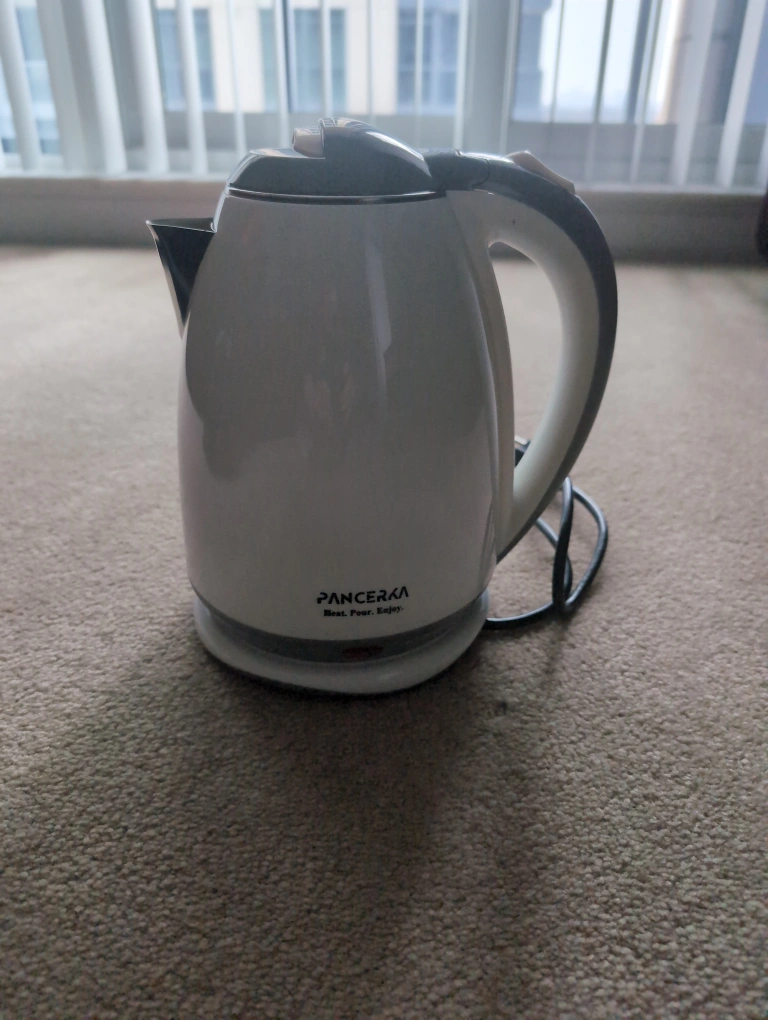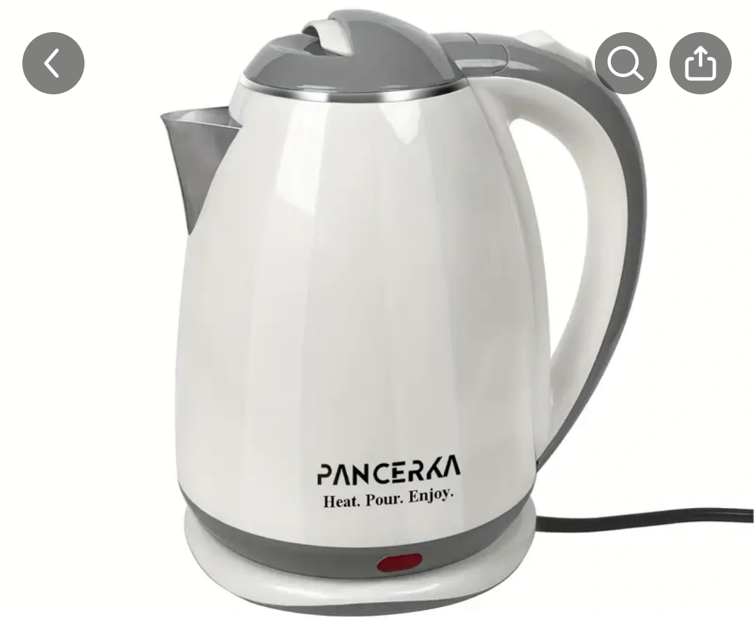 White electric kettle. Boil water quickly and easily. Features a comfortable handle and a sleek design. Great for tea, coffee, or hot water.