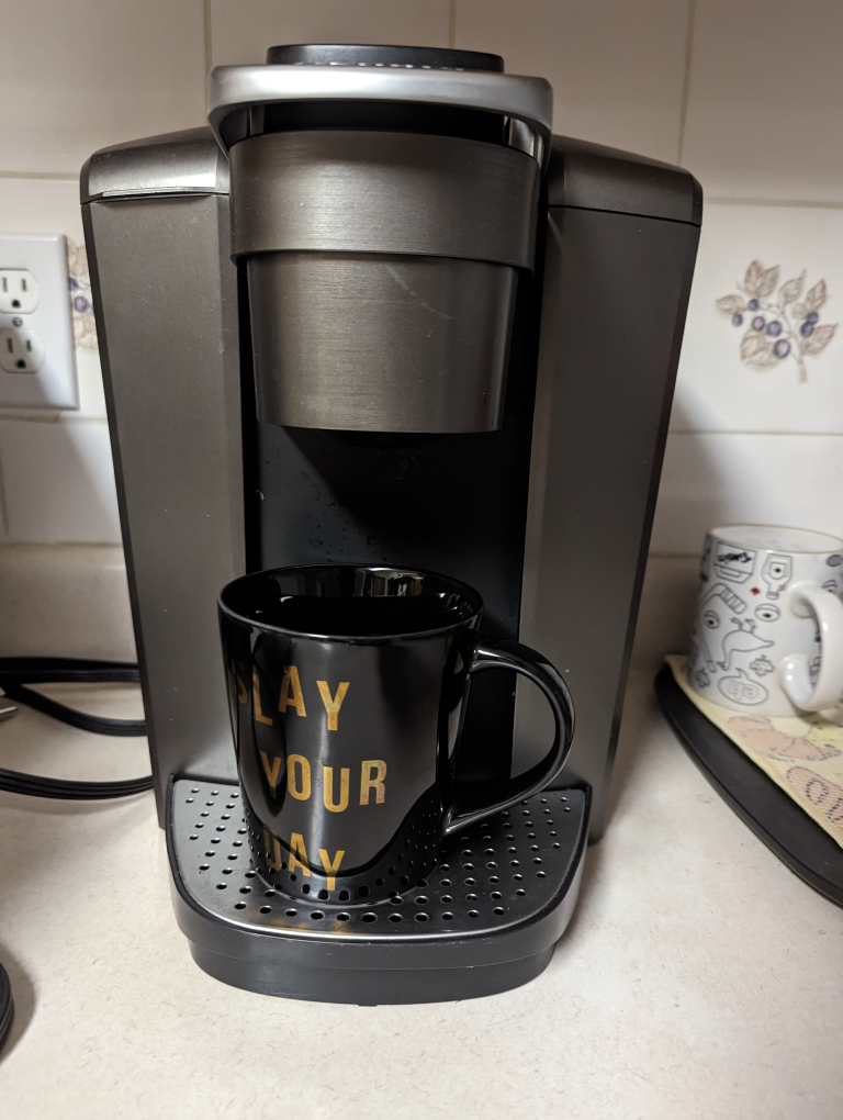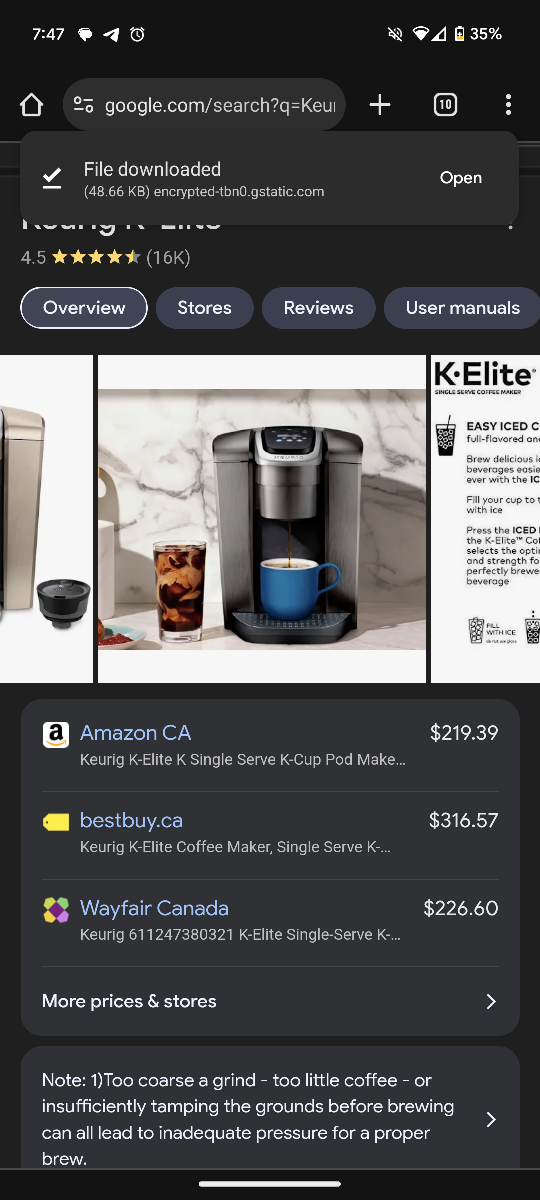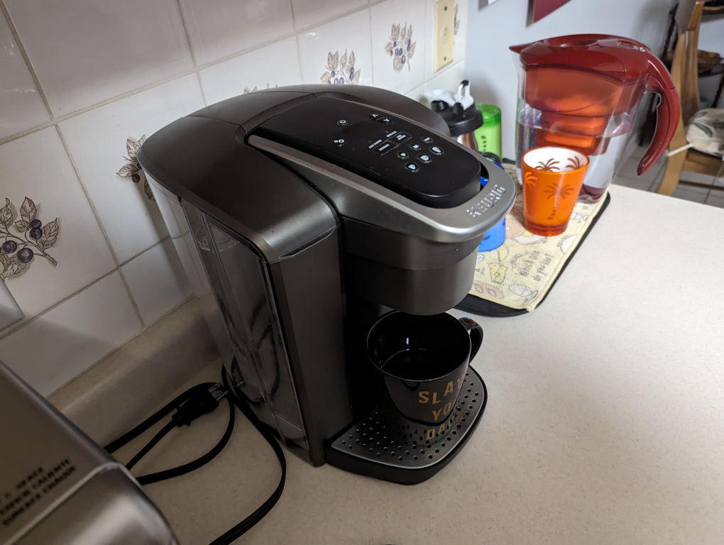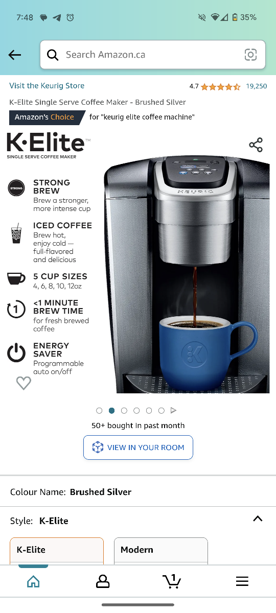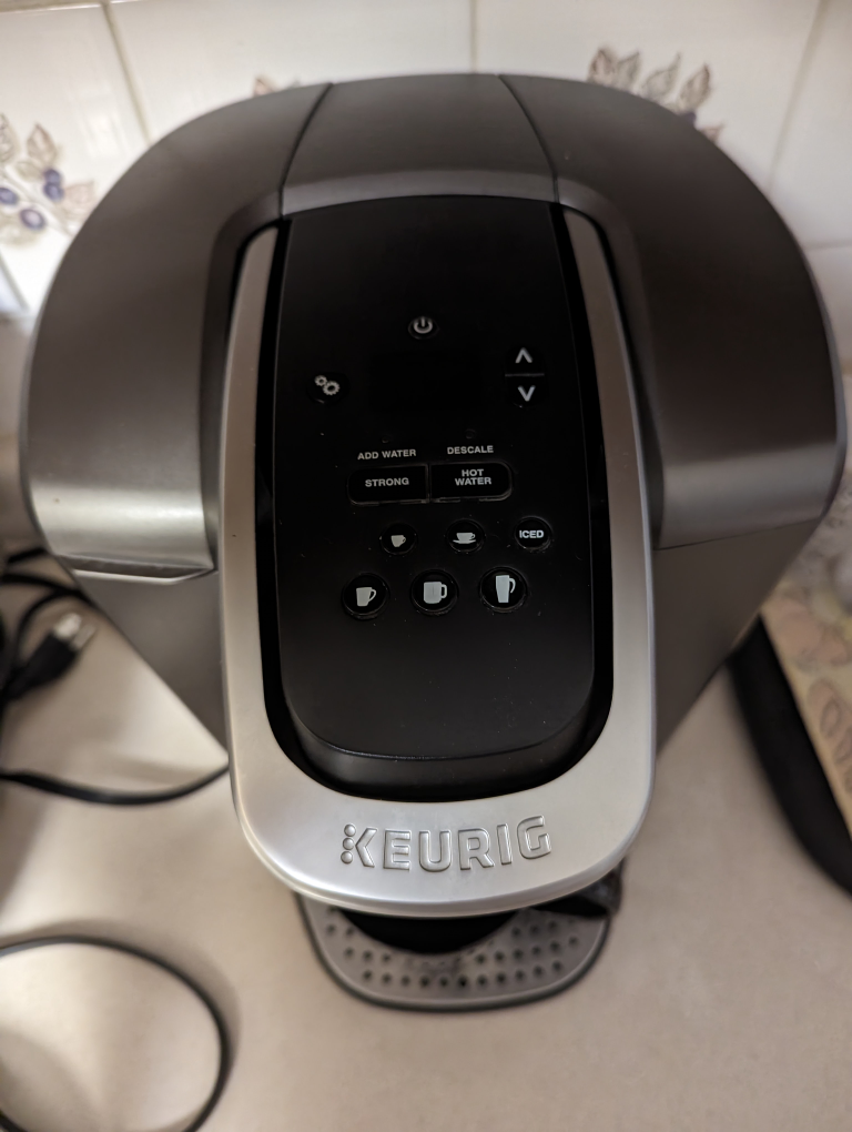 12Keurig single serve coffee maker, the K-Elite Brewer is a bold style meets bold flavour coffee maker. Its simple button controls and programmable features has 5 brew sizes; 4, 6, 8, 10 & 12 oz. for Travel Mugs so you can brew your favourite coffee, tea, hot cocoa or iced beverage in under one minute with a touch of a button. The K-Select brewer with its striking brushed finish and metal details, is a stylish addition to any kitchen. It features a "Strong Brew" setting when you want a bolder cup of coffee and an iced setting to brew hot over ice for a refreshing, full-flavored iced coffee. Its temperature control provides hot water on demand for instant soups and oatmeal and features a 75 oz. removable water reservoir that lets you brew 8 cups between refills. Features Make a great cup of coffee in the stainless steel Keurig K-Elite Brewer Features a \"Strong Brew\" setting for brewing a bolder cup of coffee Iced setting to brew hot over ice for refreshing, full-flavored iced coffee Temperature control provides hot water on demand for instant soups and oatmeal 75 oz. removable water reservoir that lets you brew 8 cups between refills Reason for sale: received new coffee maker