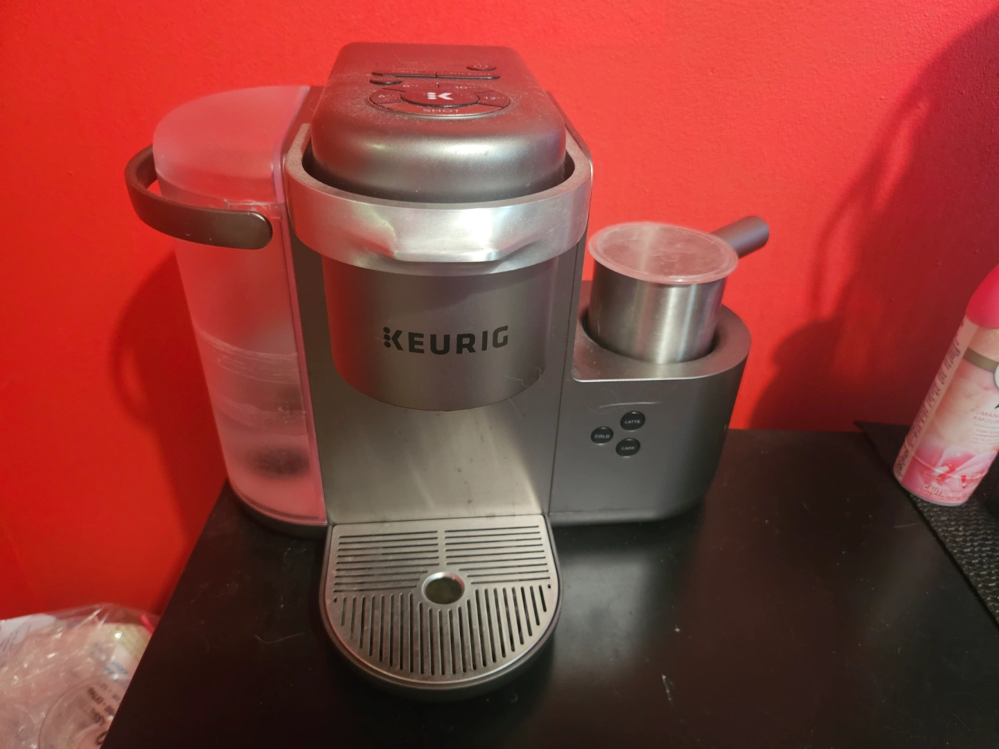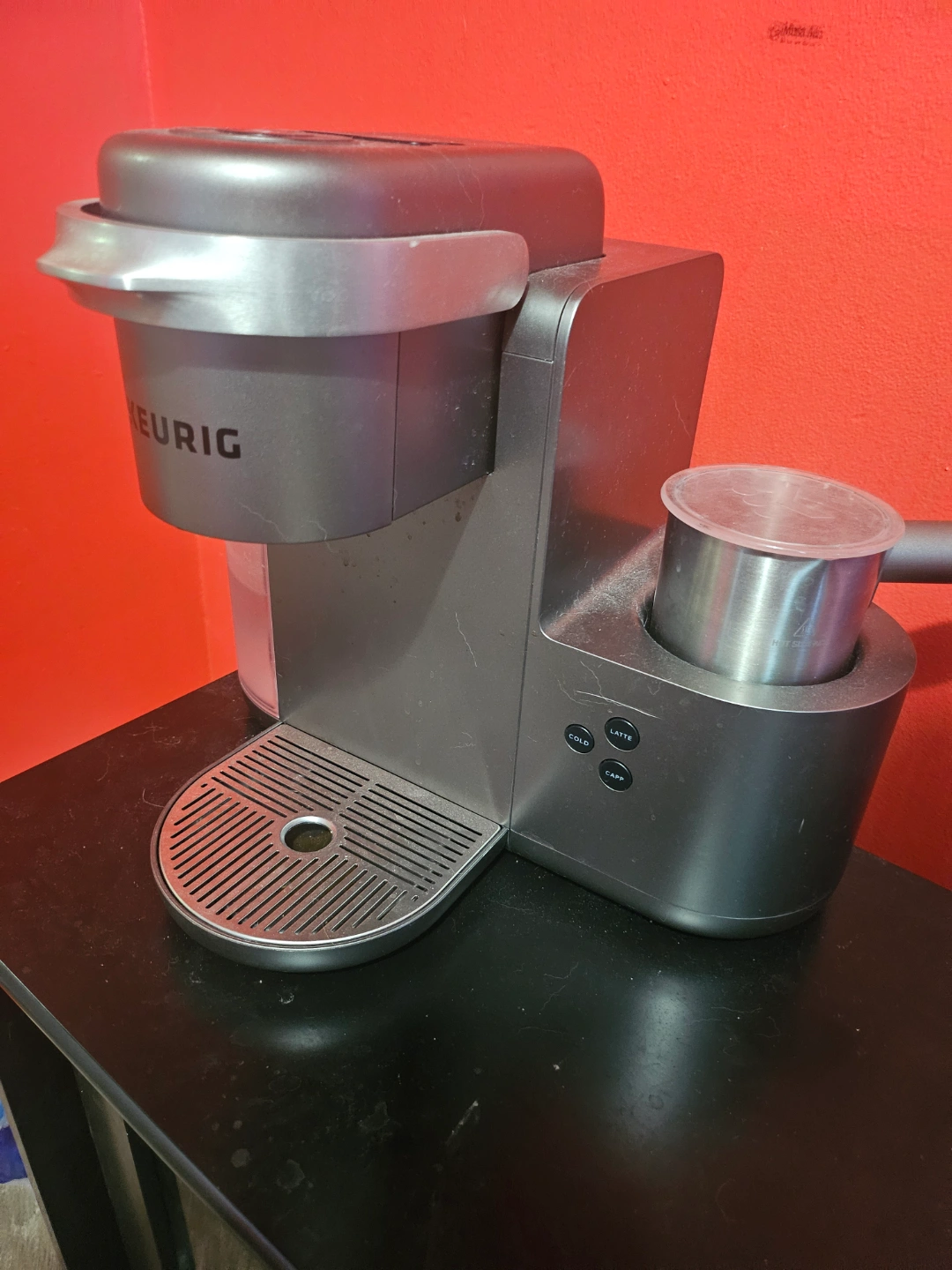 Single-serve coffee maker. Makes coffee, latte, and cappuccino. Includes milk frother. Grey and silver colour. Used condition.