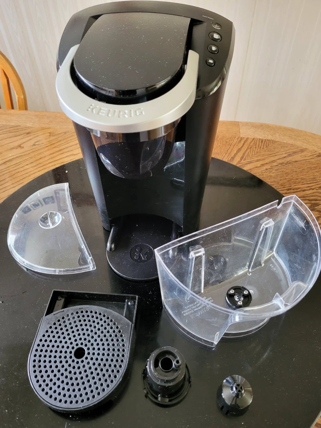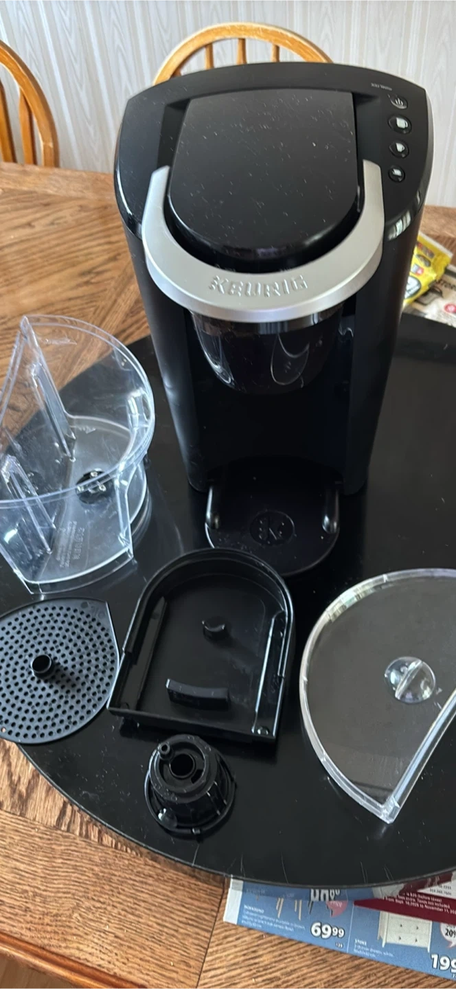 Selling a Keurig K-Mini coffee maker in black. It's in good condition and comes with all the parts shown in the pictures. Perfect for a small space or for someone who only needs to make one cup at a time!