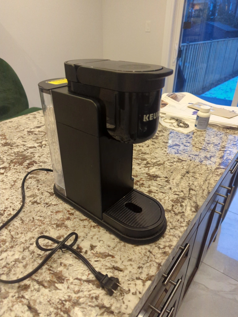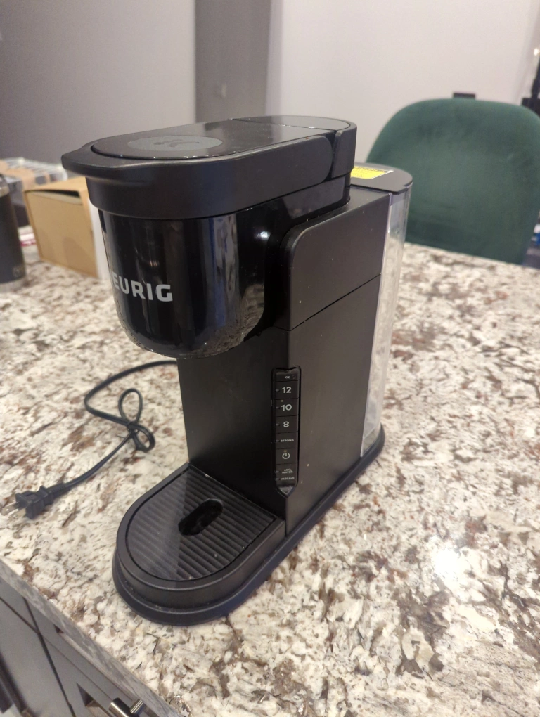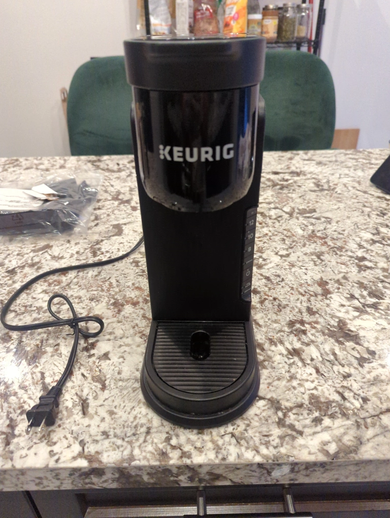 Compact single-serve coffee maker. Black colour. Makes coffee quickly and easily. Includes power cord. used occassionally, one year old.